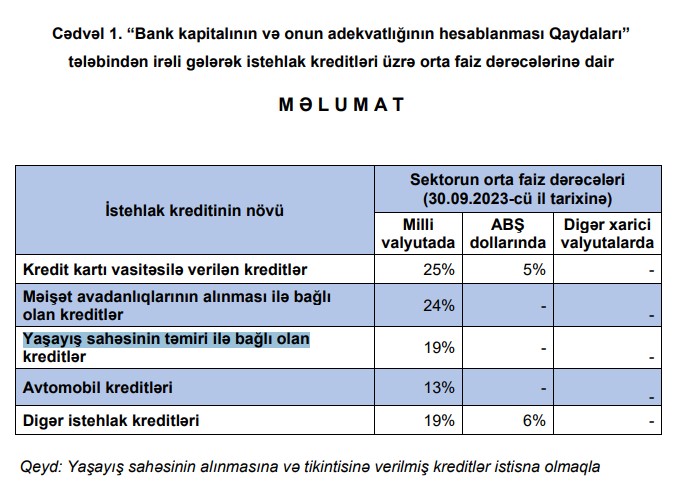 Azərbaycan Mərkəzi Bankı "Bank kapitalının və onun adekvatlığının hesablanması Qaydaları” tələbindən irəli gələrək istehlak kreditləri üzrə orta faiz dərəcələrinə dair məlumat yayıb.