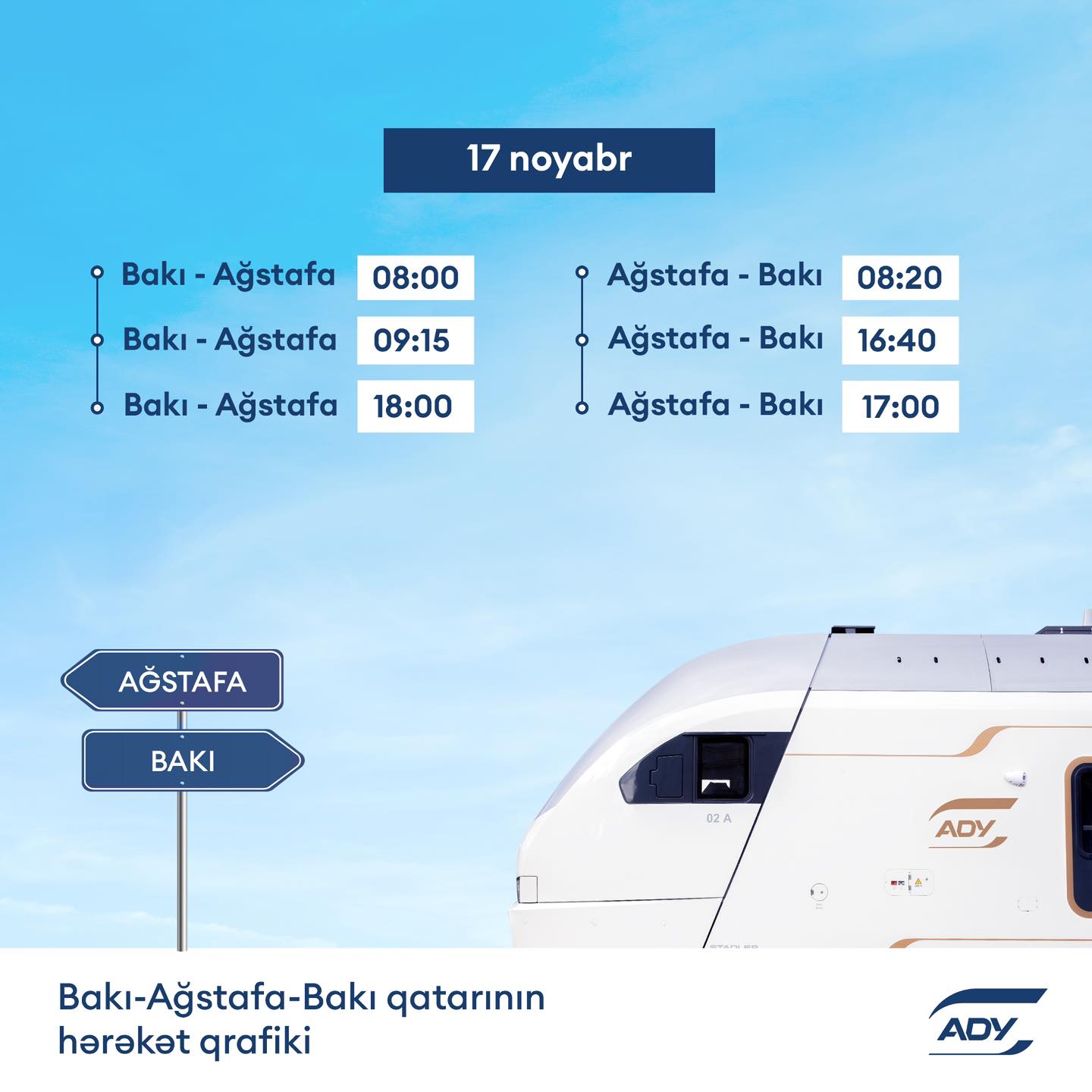 (®) Azərbaycan Dəmir Yolları (ADY) COP29 günlərində artan sərnişin tələbatını təmin etmək məqsədilə 17 noyabr tarixində Bakı-Ağstafa-Bakı marşrutu üzrə əlavə qatar reysləri təyin edir.