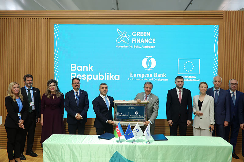 Bank Respublika və EBRD COP29 çərçivəsində yaşıl kredit sazişi imzalayıb. Beynəlxalq maliyyə qurumu Bank Respublika üçün 3 illik müddətə 7,5 milyon ABŞ dolları məbləğində sintetik kredit ayıracaq. Bank "yaşıl" kredit götürən sahibkarlara keşbek verəcək!Azərbaycanın ən böyük kommersiya banklarından biri olan Bank Respublika və Avropa Yenidənqurma və İnkişaf Bankı (EBRD), BMT-nin İqlim Dəyişmələri üzrə Çərçivə Konvensiyasının Tərəflər Konfransının 29-cu sessiyası (COP29) çərçivəsində Azərbaycanda yaşıl layihələrin maliyyələşdirilməsi üçün kredit sazişi imzalayıblar.