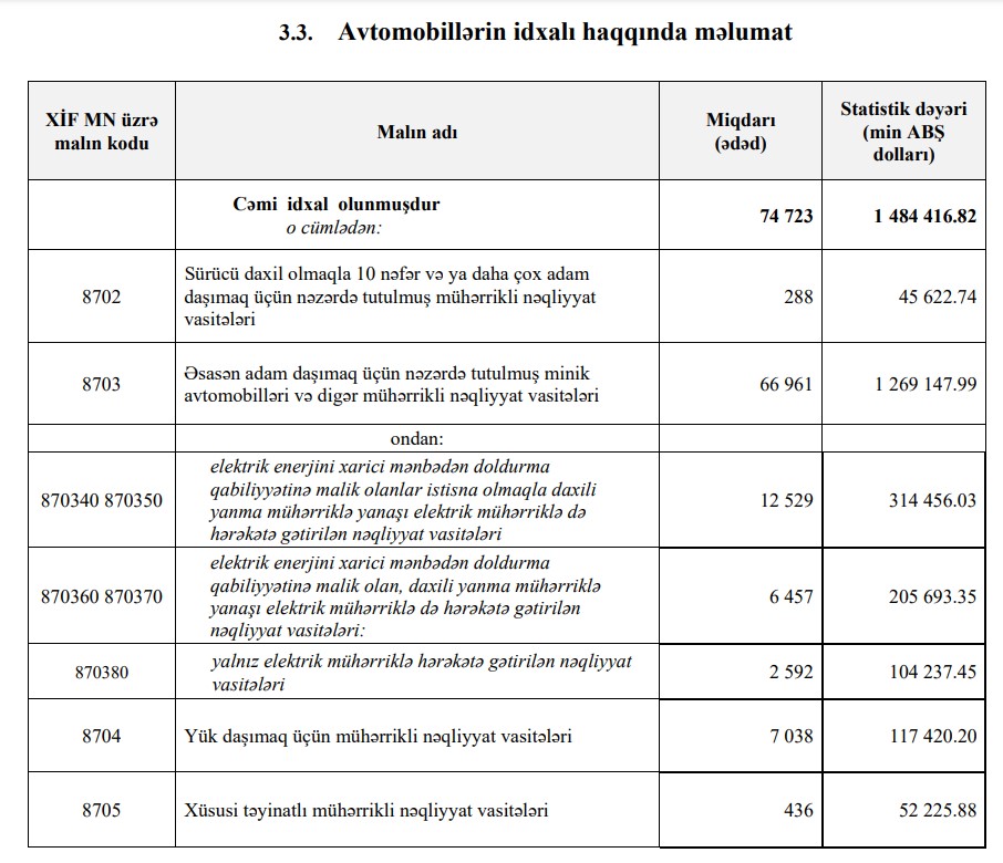 2024-cü ilin 10 ayı ərzində (yanvar-oktyabr) Azərbaycana 1 milyard 484 milyon 417 min dollar dəyərində 74 min 723 ədəd avtomobil idxal olunub. 2023-cü ilin eyni dövründə Azərbaycana 1 milyard 374 milyon 23 min dollar dəyərində 81 min 206 ədəd avtomobil idxal olunmuşdu.