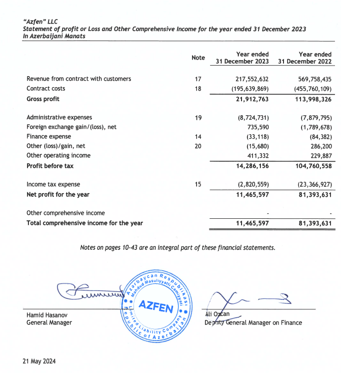 "Azfen" MMC 2023-cü ili 11 milyon 466 min manat xalis mənfəət ilə başa vurub. Şirkət 2022-ci ili 81 milyon 394 min manat xalis mənfəət ilə bağlamışdı. Beləliklə, ötən ili "Azfen"in xalis mənfəəti 69 milyon 928 min manat və ya 86% (7,1 dəfə) azalıb. Xalis mənfəətin azalması gəlirlərinin düşməsilə əlaqədardır.