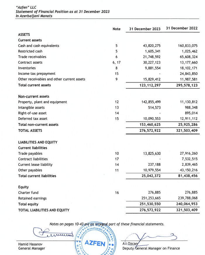Ötən il Şirkətin cəmi aktivləri 45 milyon manata yaxın və ya 14% azalaraq 276 milyon 572 min manata geriləyib. "Azfen"in cəmi aktivləri 2022-ci ilin sonunda "Azfen"in cəmi aktivləri 321milyon 503 min manata çatmışdı.