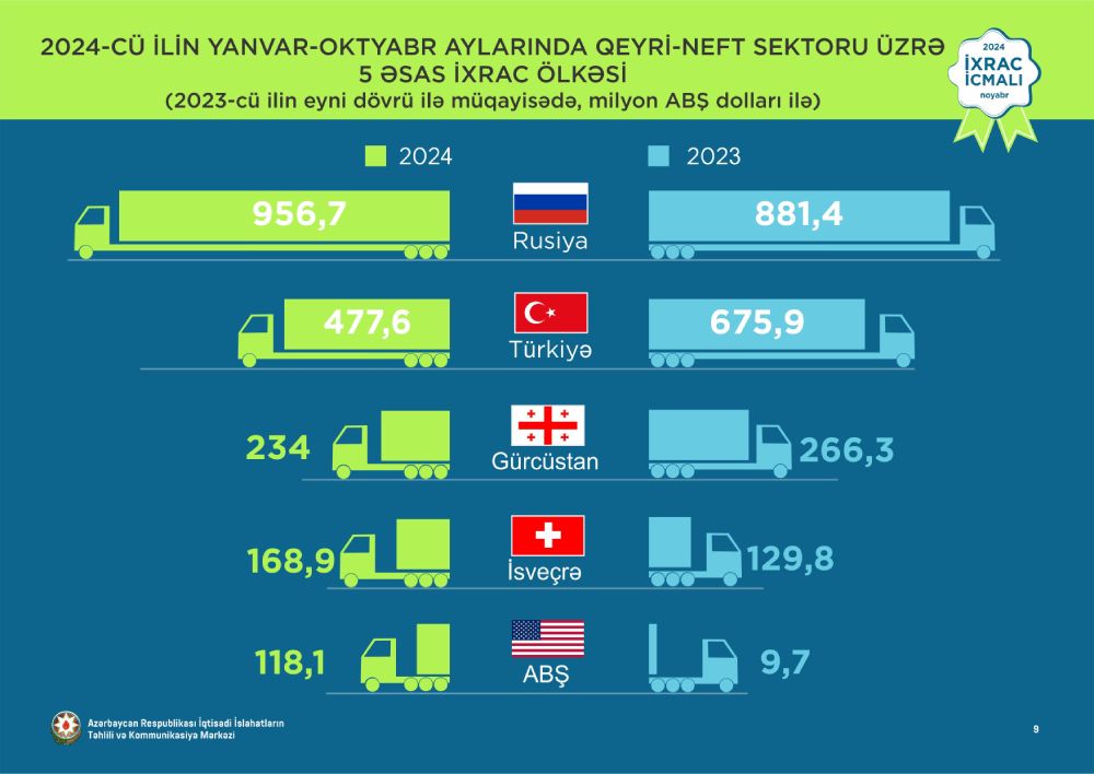 2024-cü ilin yanvar-oktyabr ərzində Rusiya Federasiyasına 956.7 milyon ABŞ dolları, Türkiyəyə 477,6 milyon ABŞ dolları, Gürcüstana 234,6 milyon ABŞ dolları, İsveçrəyə 168,9 milyon ABŞ dolları, ABŞ-a isə 118,1 milyon ABŞ dolları dəyərində qeyri-neft sektoruna aid mal ixrac olunub.