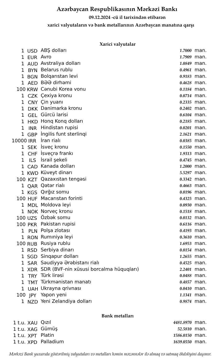 Rəsmi məzənnələr açıqlandı