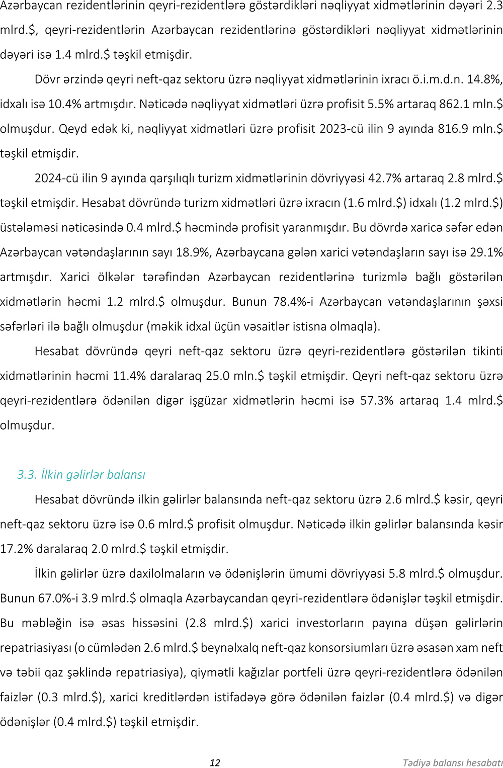 Qeyd edilib ki, 2024-cü ilin 9 ayı ərzində cari əməliyyatlar balansında 4 milyard dollar profisit formalaşmış (ötən ilin eyni dövrü ilə müqayisədə 40,3% az), kapitalın və maliyyənin hərəkəti balansında isə 3,6 milyard dollar kəsir formalşmışdır. Nəticədə tədiyyə balansının profisiti təxminən 181,6 milyon dollar olub. Bu, ötən ilin eyni dövrü ilə müqayisədə 35 dəfədən çox azdır.