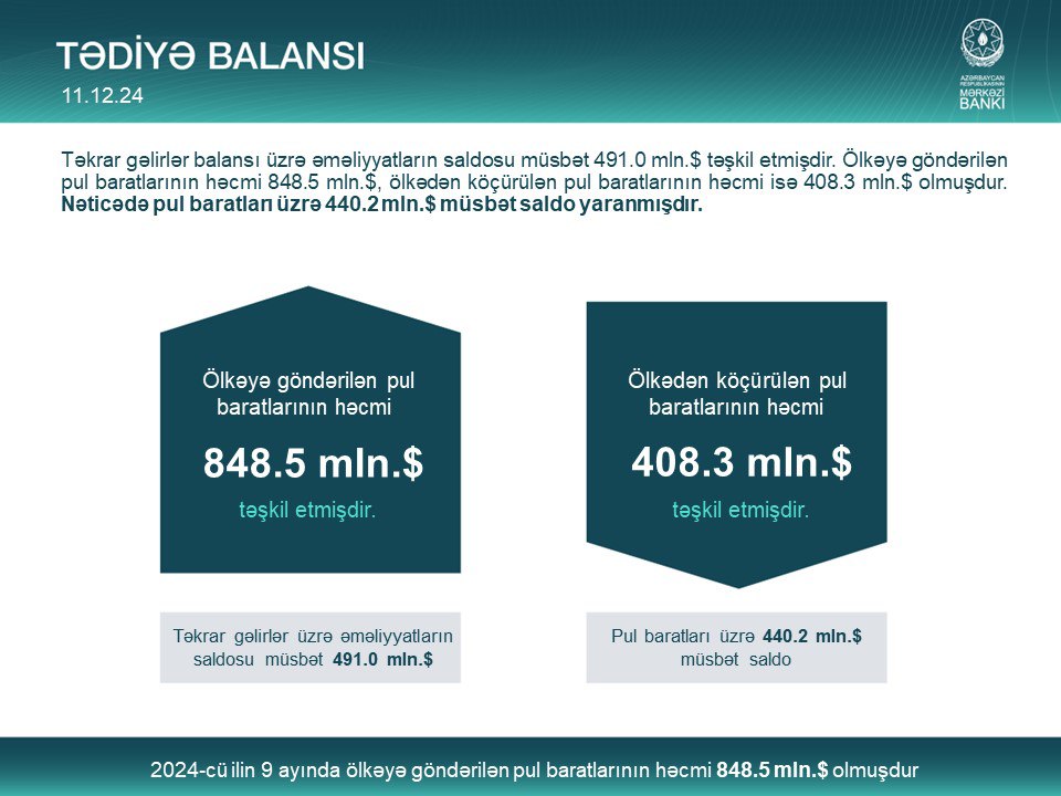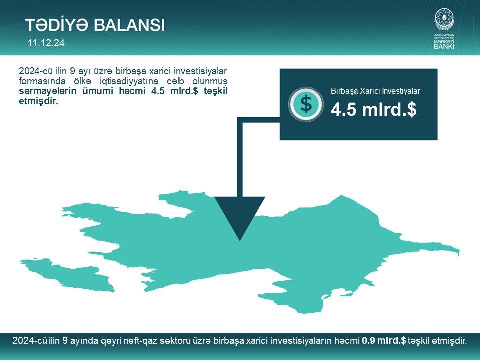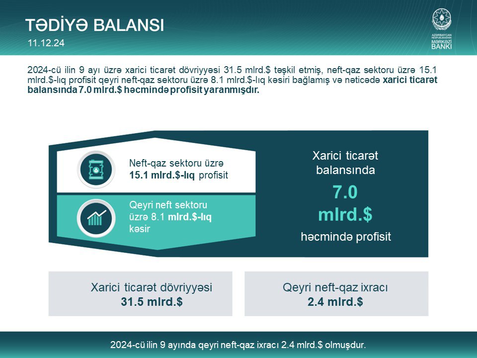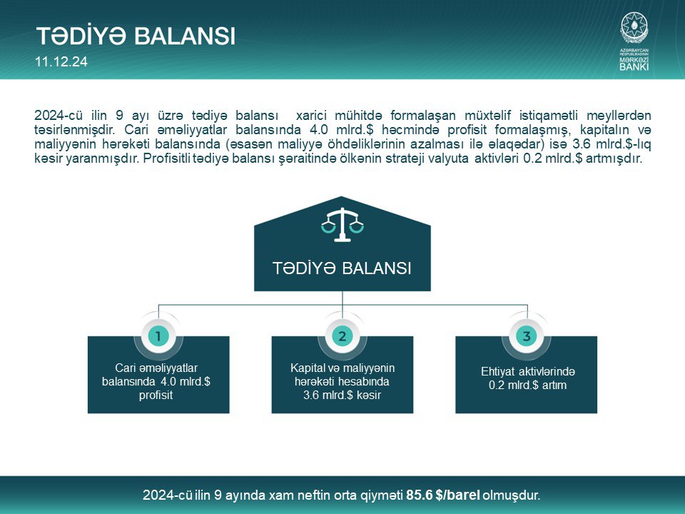 2024-cü ilin 9 ayı üzrə Azərbaycanın tədiyə balansı barədə infoqrafik.