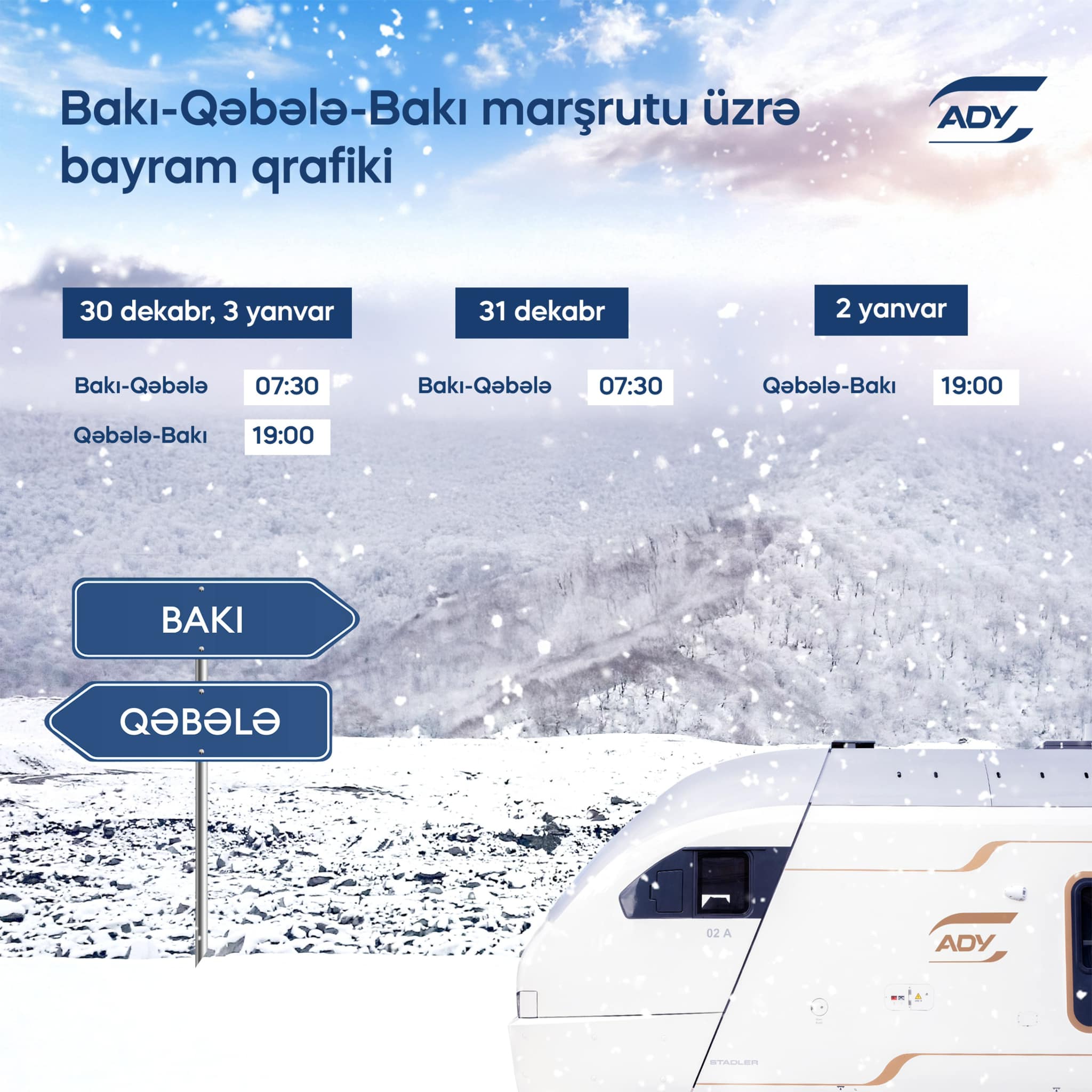 Azərbaycan Dəmir Yolları (ADY) qarşıdan gələn bayram günlərində sərnişin tələbatını təmin etmək məqsədilə 3 yanvar tarixində Bakıdan Qəbələyə və Qəbələdən Bakıya əlavə qatar reysləri təyin edir.