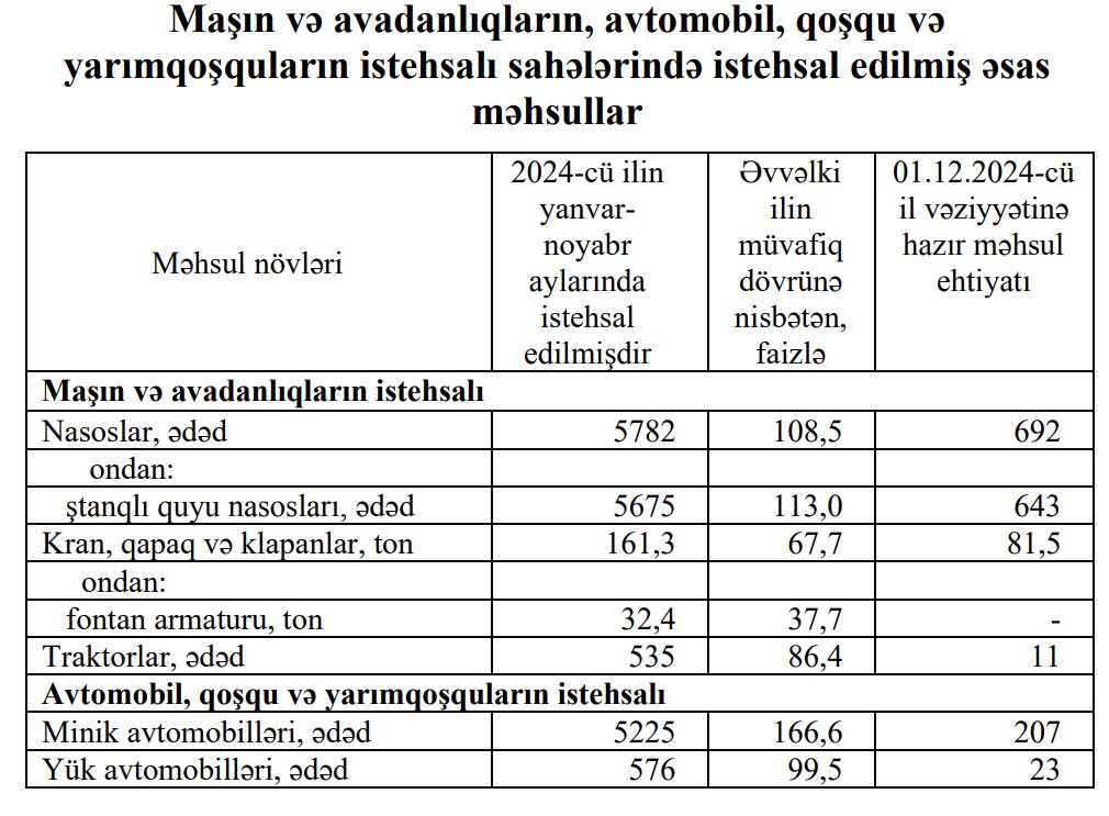2024-cü ilin yanvar-noyabr aylarında 576 ədəd yük avtomobili istehsal edilmişdir. İstehsal əvvəlki ilin müvafiq dövrünə nisbətən 0,5% azalıb.