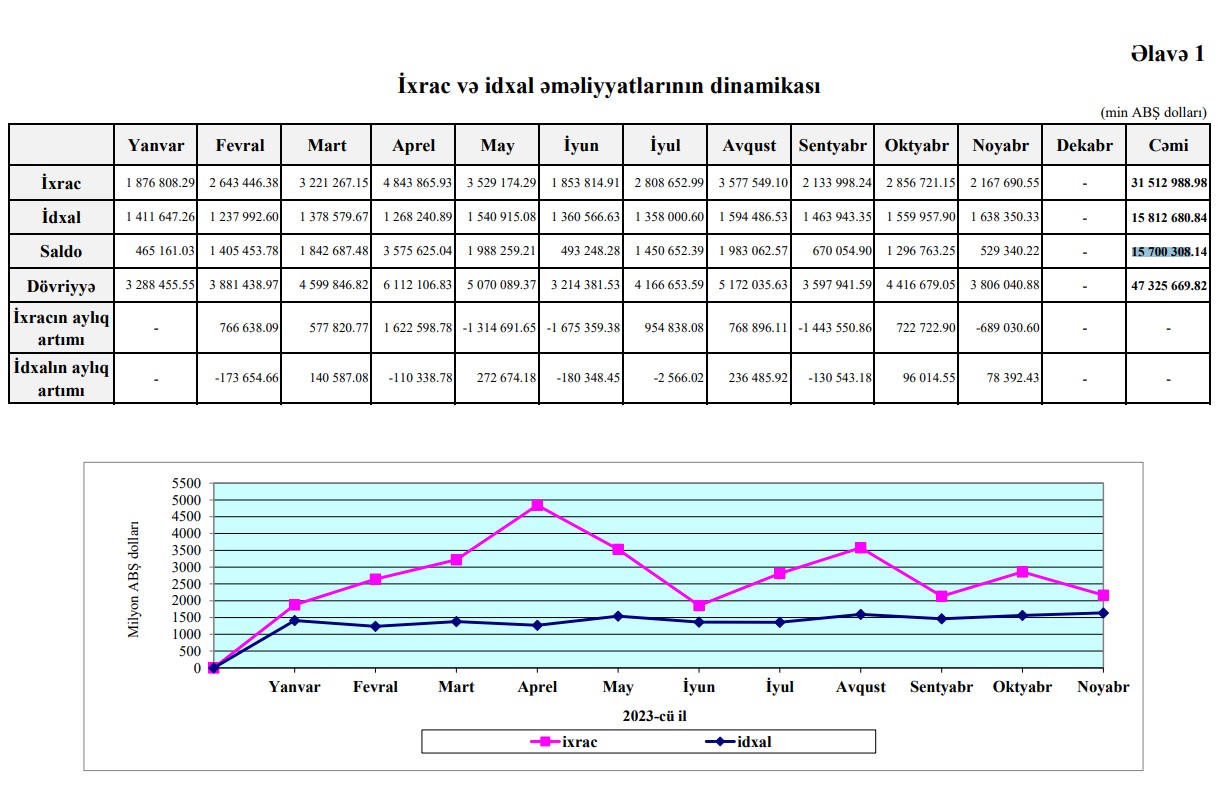 Müqayisə üçün qeyd edək ki, 2023-cü ilin 11 ayı ərzində ticarət əməliyyatlarının cəmi həcmi 47 milyard 325 milyon 670 min ABŞ dolları, o cümlədən ixrac 31 milyard 512 milyon 989 min ABŞ dolları, idxal 15 milyard 812 milyon 681 min ABŞ dolları, saldo müsbət 15 milyard 700 milyon 308 min ABŞ dolları olmuşdu.