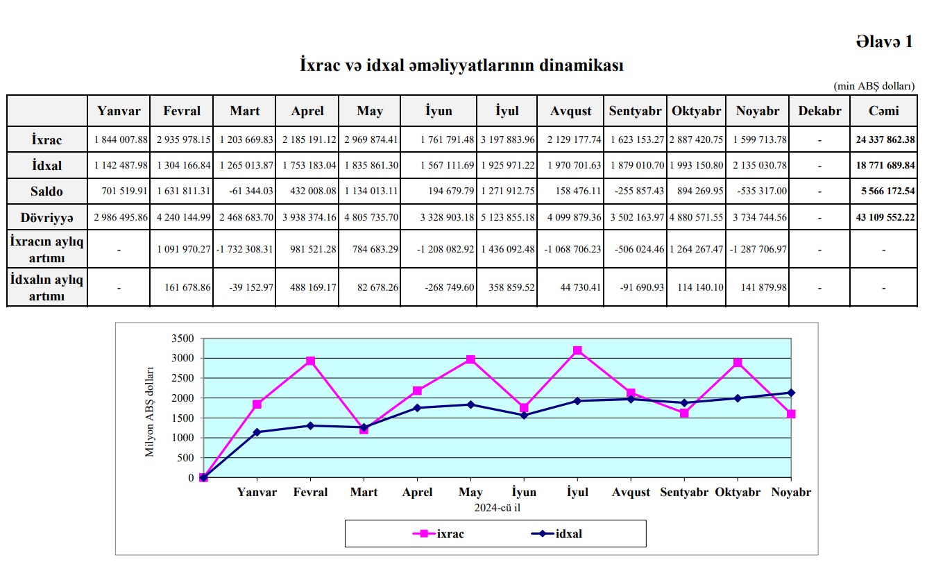Azərbaycanın xarici ticarət dövriyyəsinin müsbət saldosu 3 dəfəyə yaxın azalıb. Son bir ildə ölkə üzrə ixrac 22.8% azalaraq 24 milyard 337 milyon 862 min ABŞ dolları, idxal isə 18.7% artaraq 18 milyard 771 milyon 690 min ABŞ dolları təşkil edib.2024-cü ilin 11 ayı ərzində (yanvar-noyabr) Azərbaycanın xarici ticarət əməliyyatlarının cəmi həcmi 43 milyard 109 milyon 552 min ABŞ dolları təşkil edib.