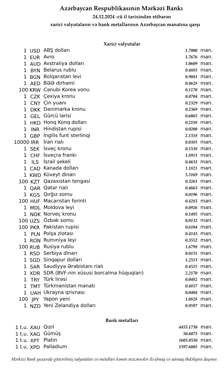Dolların bazar ertəsi üçün rəsmi məzənnəsi müəyyən olunub