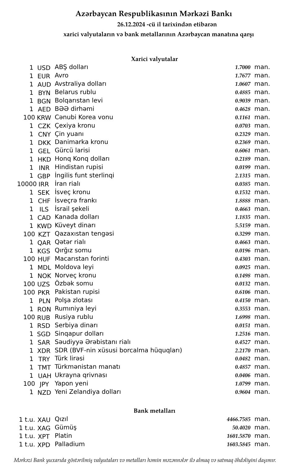 Rəsmi məzənnələr açıqlandı