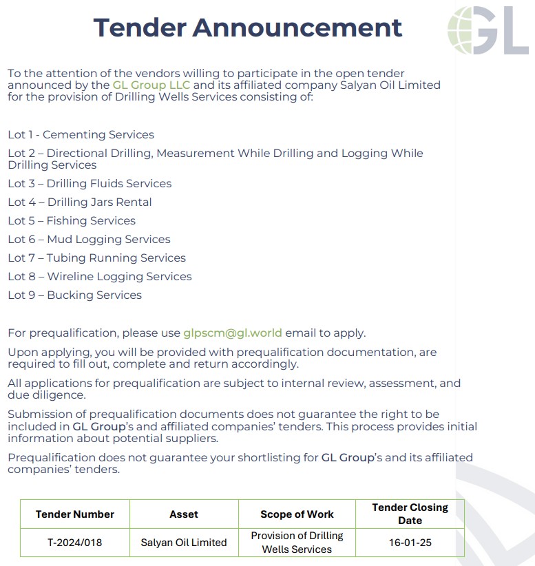 "GL Group" MMC və onun afilə şirkəti "Salyan Oil Limited" tərəfindən "Qazma Üzrə Quyu Xidmətlərinin göstərilməsi" üçün elan edilən aşağıdakılardan ibarət açıq tenderdə iştirak etmək istəyən podratçıların nəzərinə: