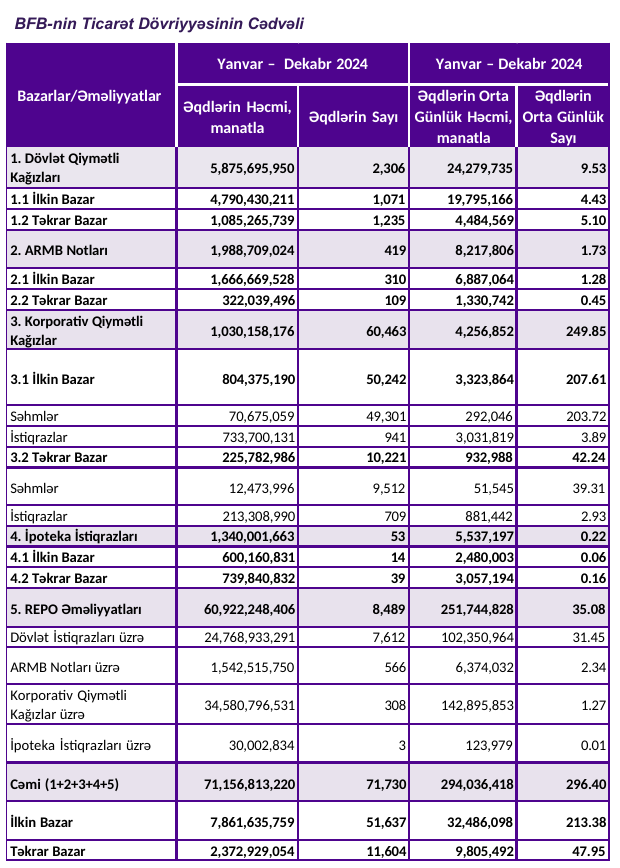 2024-cü ildə Bakı Fond Birjasında (BFB) qiymətli kağızlar üzrə keçirilən əməliyyatların ümumi həcmi 71 milyard 156 milyon 813 min manat təşkil edib.