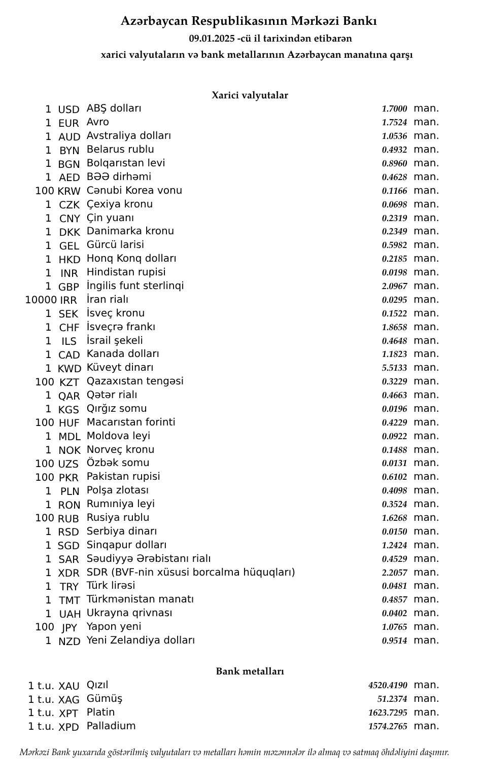 Dolların bazar ertəsi üçün rəsmi məzənnəsi müəyyən olunub