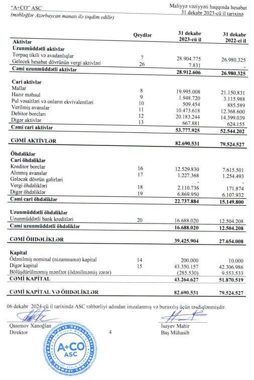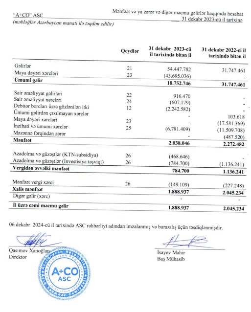 Marja.az xəbər verir ki, "A+CO" ASC-nin satışdan gəlirləri 2022-ci ildə 31 milyon 747 min manat ikən, 2023-cü ildə 54 milyon 448 min manata yüksəlib (22 milyon 701 min manat və ya 71,5% artıb ). Həmçinin, 2023-cü ildə Şirkətin maya dəyəri üzrə xərcləri 2,5 dəfəyə yaxın (26 milyon 114 min manat və 150%) artaraq 2022-ci ildəki 17 milyon 581 min manatdan 43 milyon 695 min manata yüksəlib. Şirkətin ümumi və inzibati xərcləri də artıb, 2 milyon 243 min manat debitor borclar üzrə itiki baş verib. Xərclər gəlirlərdən daha çox artıdığı üçün "A+CO" ASC-nin xalis mənfəəti azalıb.