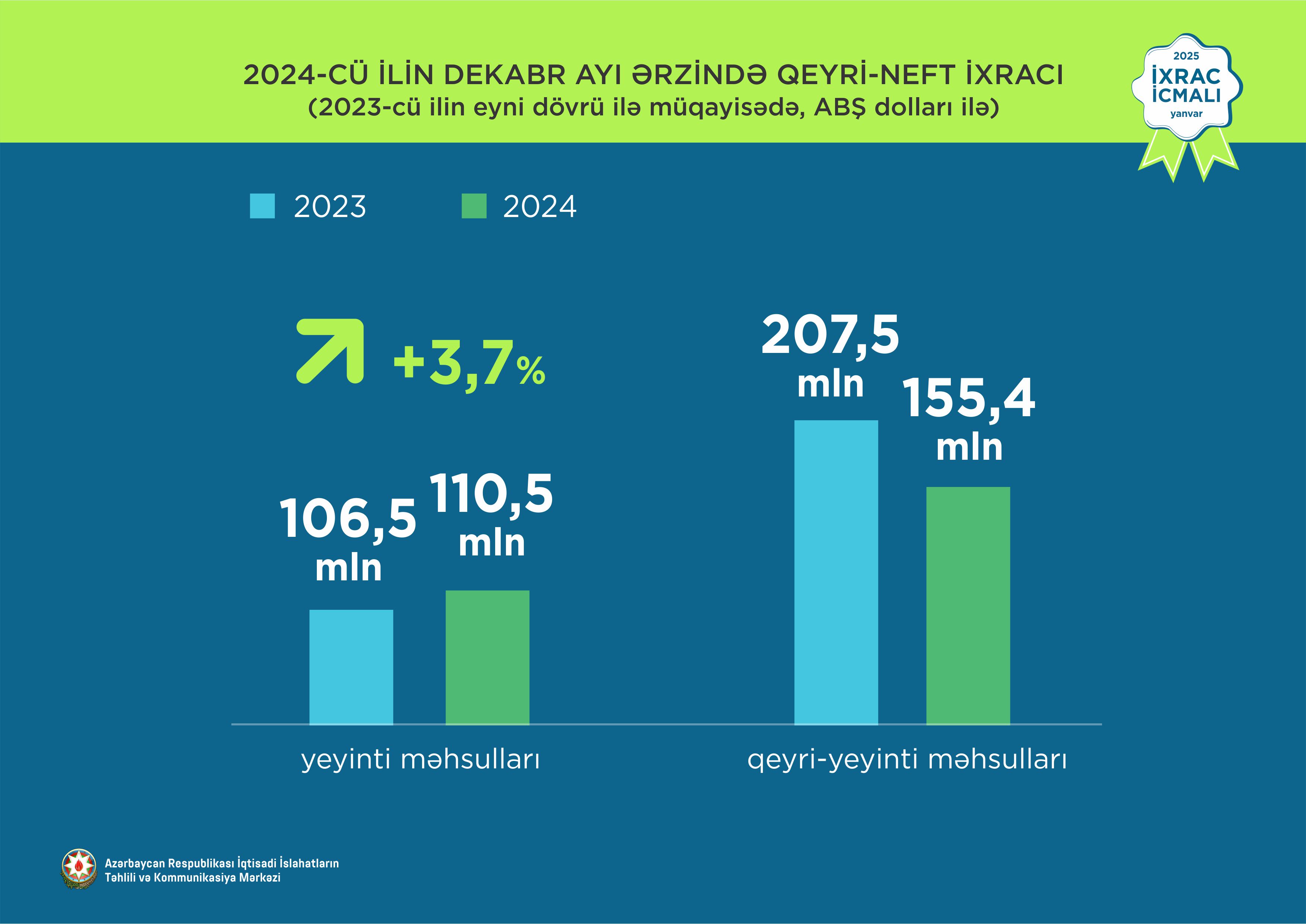 İcmala əsasən, 2024-cü ilin yanvar-dekabr ayları ərzində Azərbaycanın qeyri-neft-qaz ixracı 2023-cü ilin müvafiq dövrü ilə müqayisədə 0,3% artaraq 3,4 milyard ABŞ dolları təşkil edib.