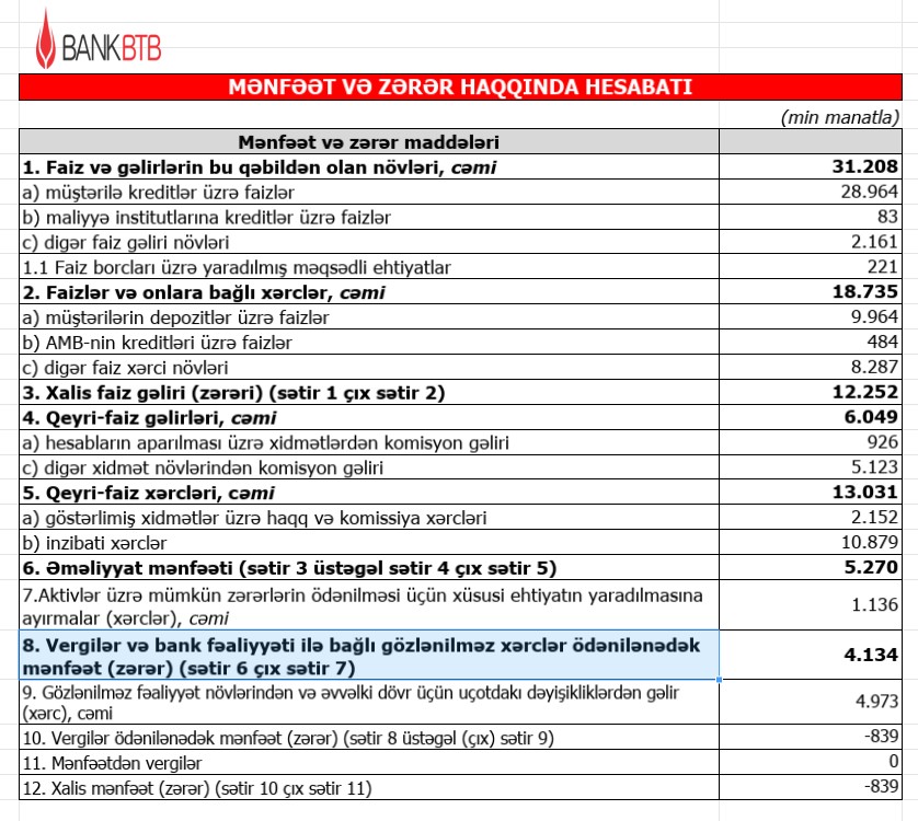 Bank “BTB” 2024-cü ilin 4-cü rübü üzrə maliyyə göstəricilərini açıqlayıb.
