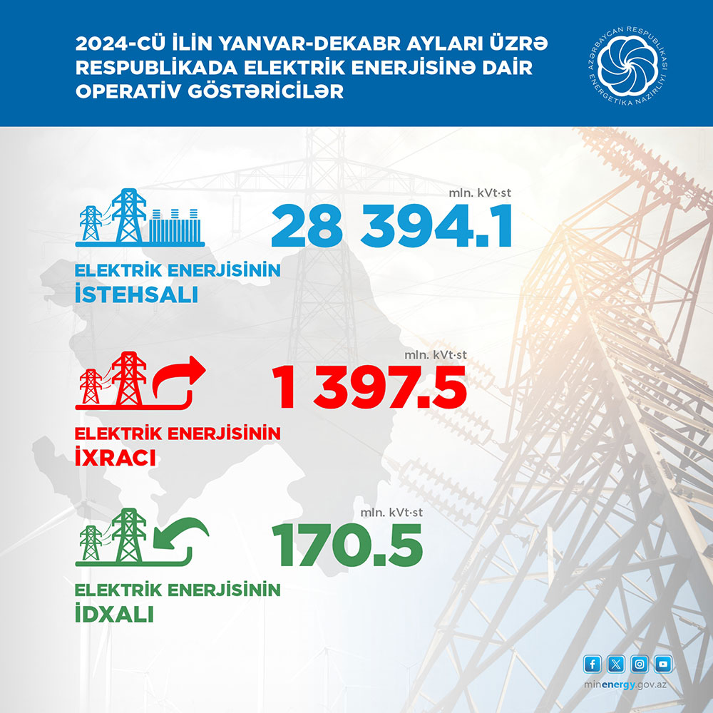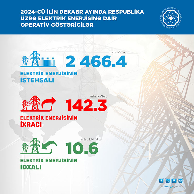 Qeyd edək ki, 2024-cü ilin dekabr ayında respublika üzrə elektrik enerjisinin istehsalı 2 466,4 mln. kVt·st olub. Bu dövrdə elektrik enerjisinin ixracı 142,3 mln. kVt·st, idxalı isə 10,6 mln. kVt·st təşkil edib.