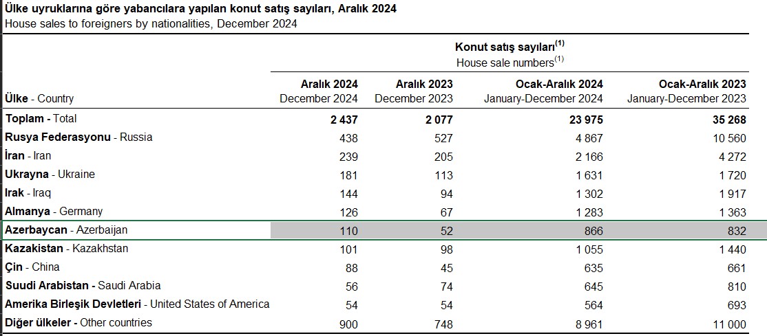 2024-cü il ərzində (yanvar-dekabr) Azərbaycan vətəndaşları Türkiyədə 866 ev əldə ediblər.