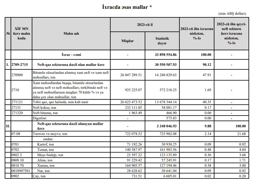 2024-cü ildə Azərbaycanın neft-qaz sektoruna daxil olmayan mallar üzrә ixracının cəmi dəyəri 3 milyard 356 milyon 507 min dollar olub. Bu dəyər 2023-cü ildə 3 milyard 348 milyon 47 min dollar təşkil etmişdi. Beləliklə, ötən il Azərbaycanın qeyri-neft-qaz ixracı 8 milyon 461 min dollar və ya 0,25% artıb.