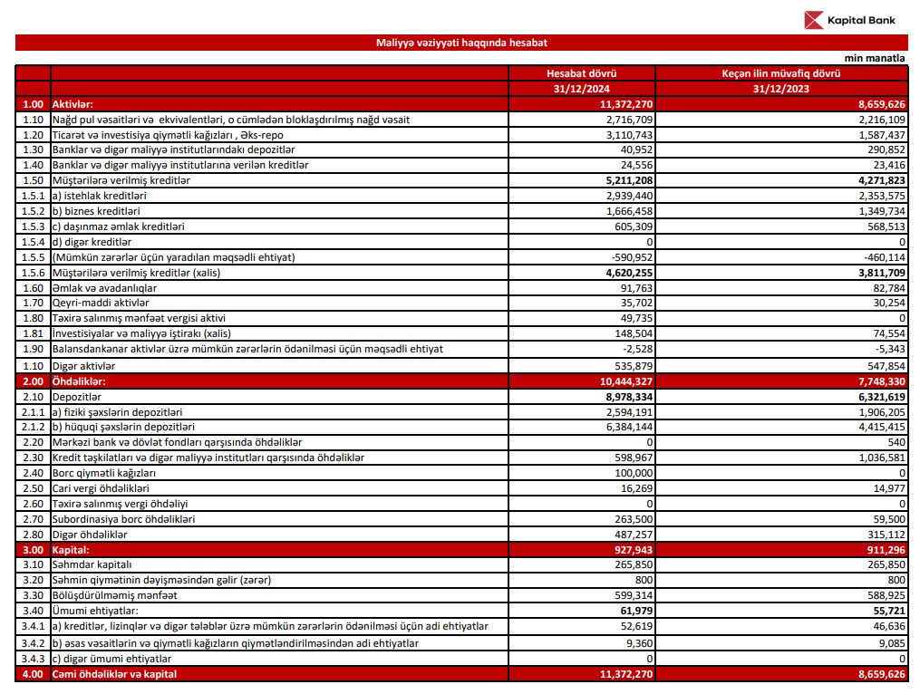 2024-cü ildə "Kapital Bank" ASC-nin cəmi kredit porfeli (müştərilərə verilmiş cəmi kreditlər) 939 milyon 385 min manat və ya 22% artaraq 31 dekabr 2024-cü il tarixində 5 milyard 211 milyon 208 min manata çatıb.