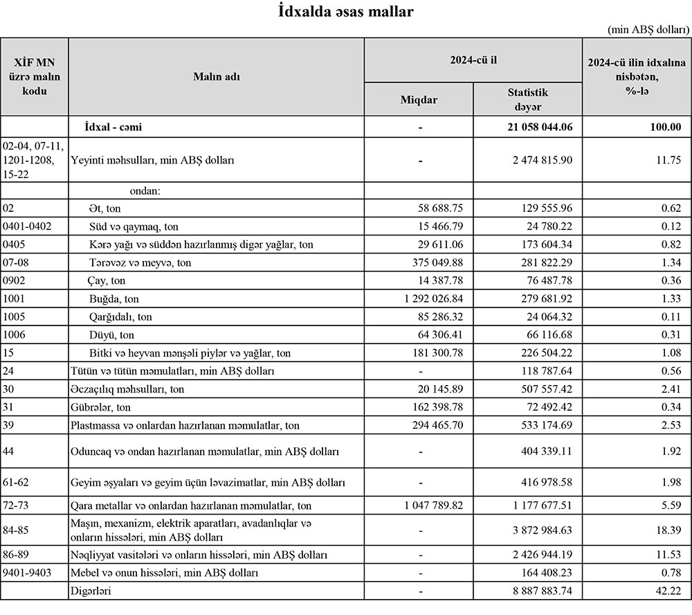 Beləliklə, Azərbaycana bitki və heyvan mənşəli piylər və yağların idxalı 2024-cü ildə 2023-cü illə müqayisədə dəyər ifadəsilə 42 milyon 828 min dollar və ya 23,3%, miqdar ifadəsilə 34 min 14 ton və ya 23,1% artıb.