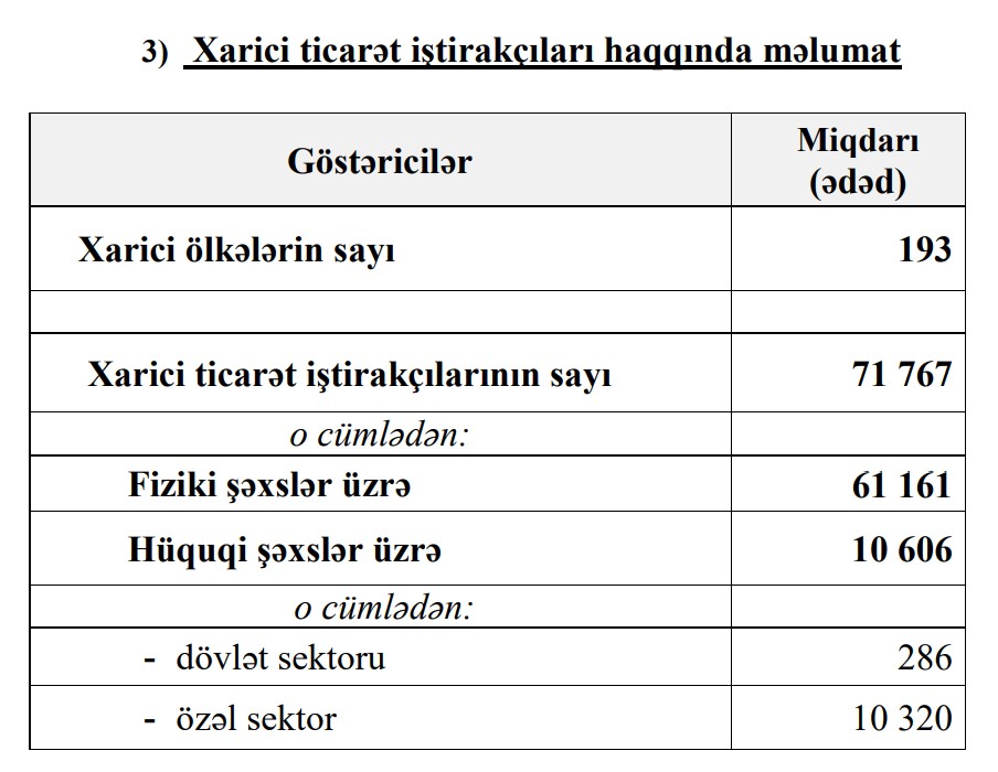 2023-cü ildə Azərbaycanda xarici ticarət iştirakçılarının sayı 71 min 767 şəxs təşkil etmişdi.