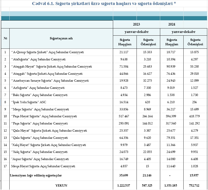 2024-cü ildə Azərbaycanın sığorta şirkətləri tərəfindən 1 milyard 353 milyon 185 min maat sığorta haqları hesablanıb, 752 milyon 712 min manat sığorta ödənişləri həyata keçirilib.