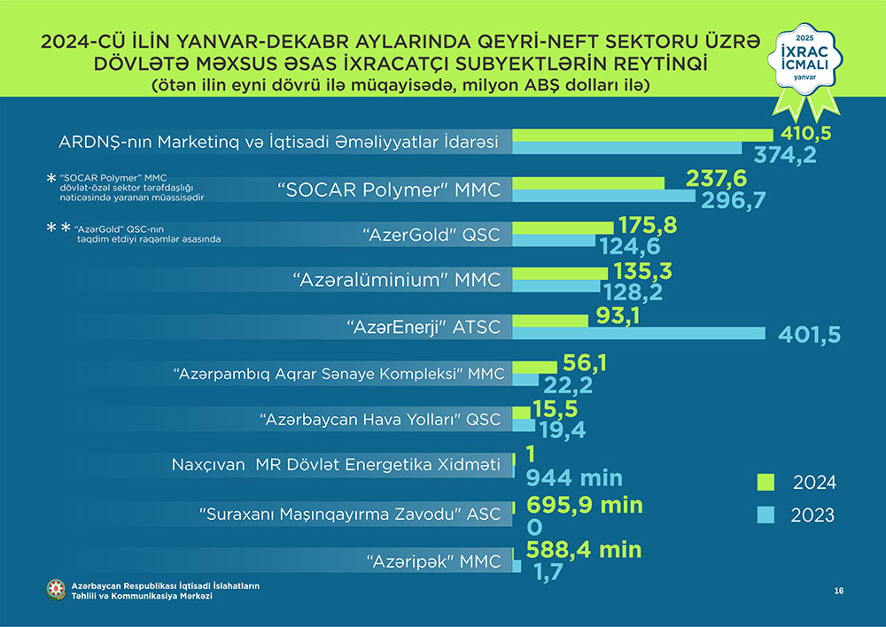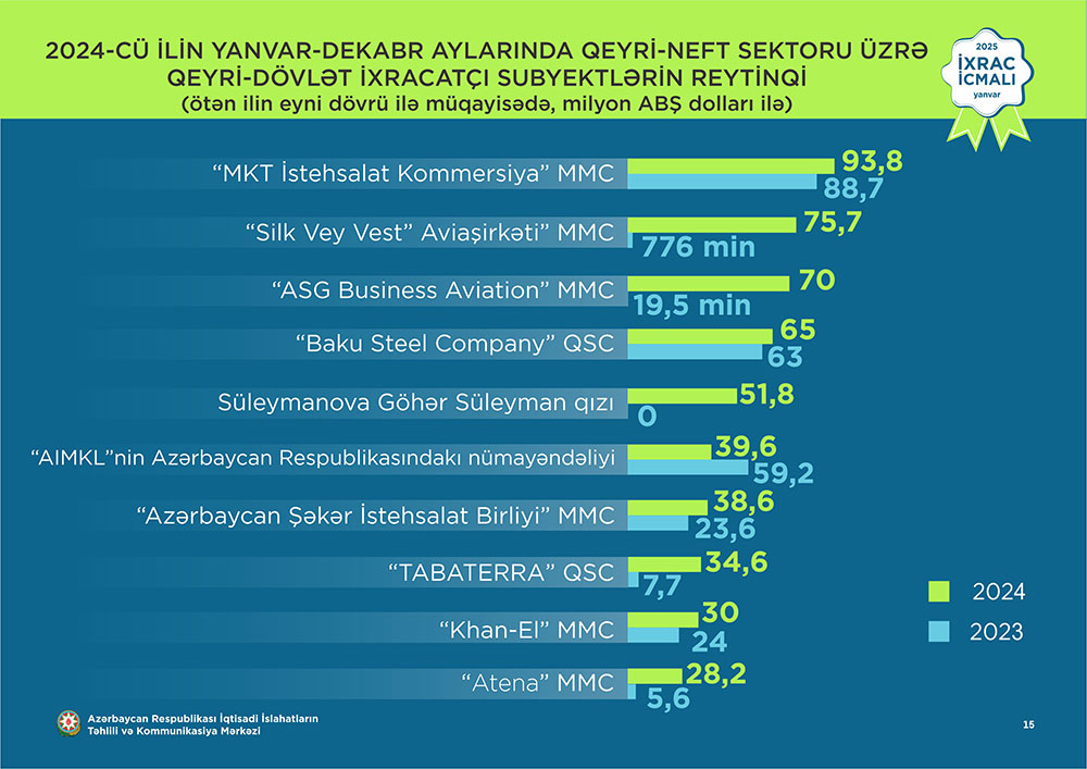 Marja.az xəbər verir ki, İcmala əsasən, 2024-cü ilin yanvar-dekabr ayları üzrə hazırlanmış qeyri-dövlət ixracatçı subyektlərin reytinqində ilk onluqda aşağıdakı şirkətlər təmsil olunublar: