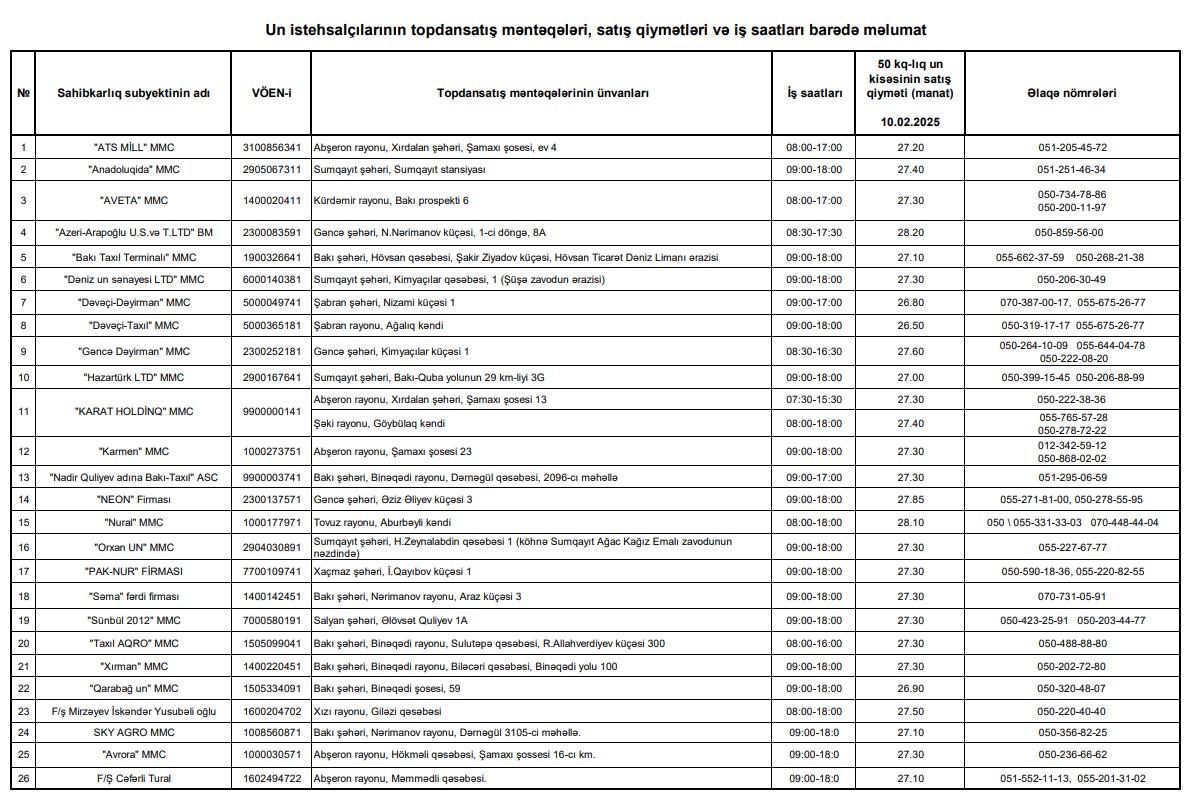 Un istehsalçılarının topdansatış məntəqələri, satış qiymətləri və iş saatları barədə məlumat - 10.02.2025
