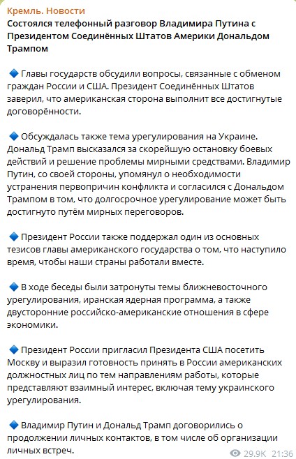 Bu, Rusiya və ABŞ liderləri arasında son 3 ildə ilk söhbət olub. Rusiya prezidenti sonuncu dəfə Trampın sələfi Co Baydenlə eyni gündə - 2022-ci il fevralın 12-də danışıb.