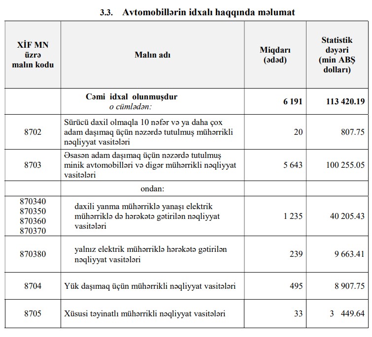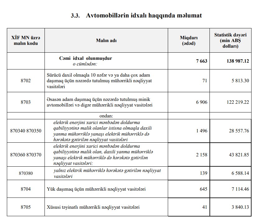 2025-ci ilin Yanvar ayında Azərbaycana 138 milyon 987 min dollar dəyərində 7 min 663 ədəd avtomobil (nəqliyyat vasitəsi) idxal olunub.
