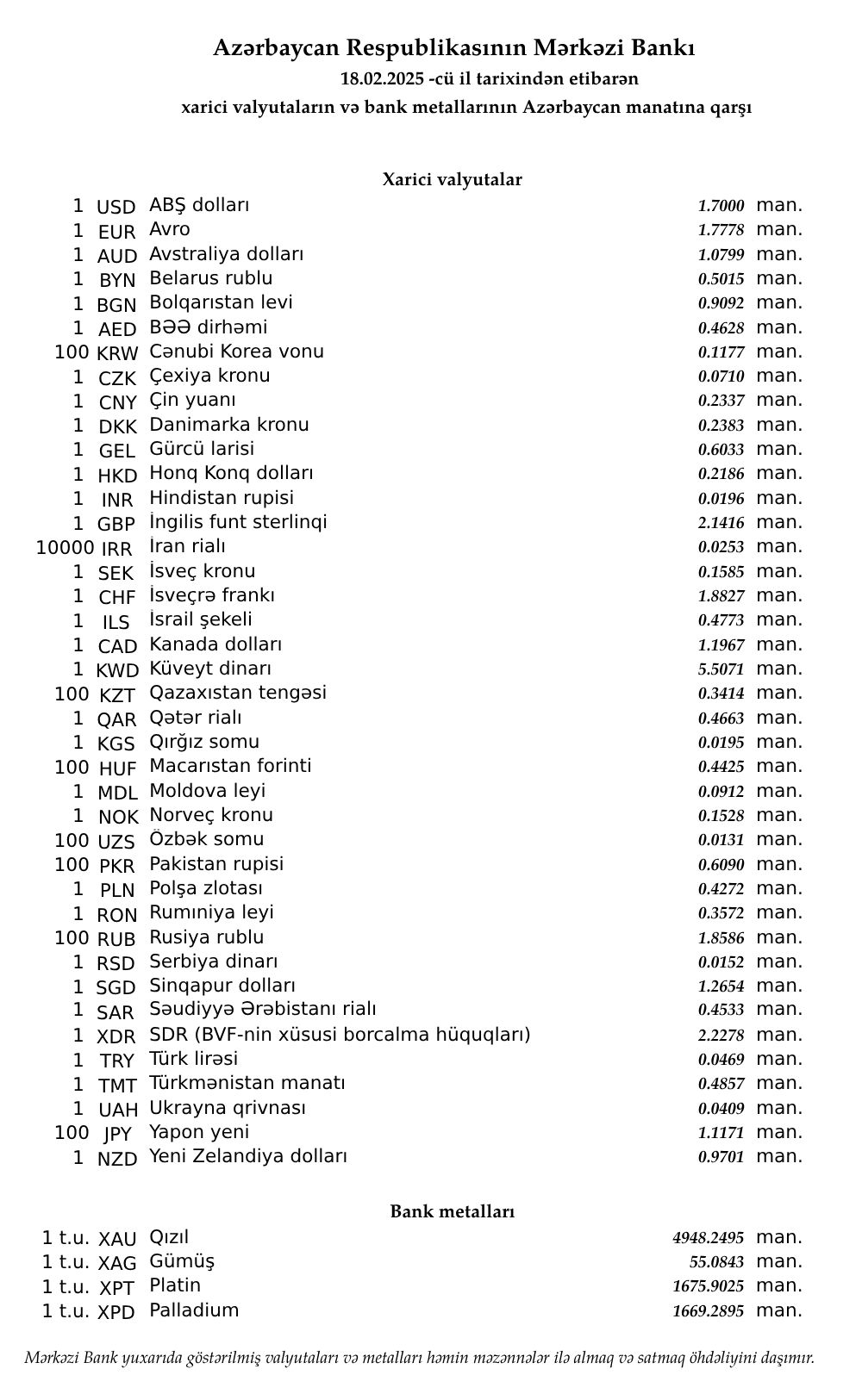 Rəsmi məzənnələr açıqlandı