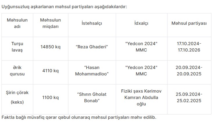 Uyğunsuzluq aşkarlanan məhsul partiyaları aşağıdakılardır: