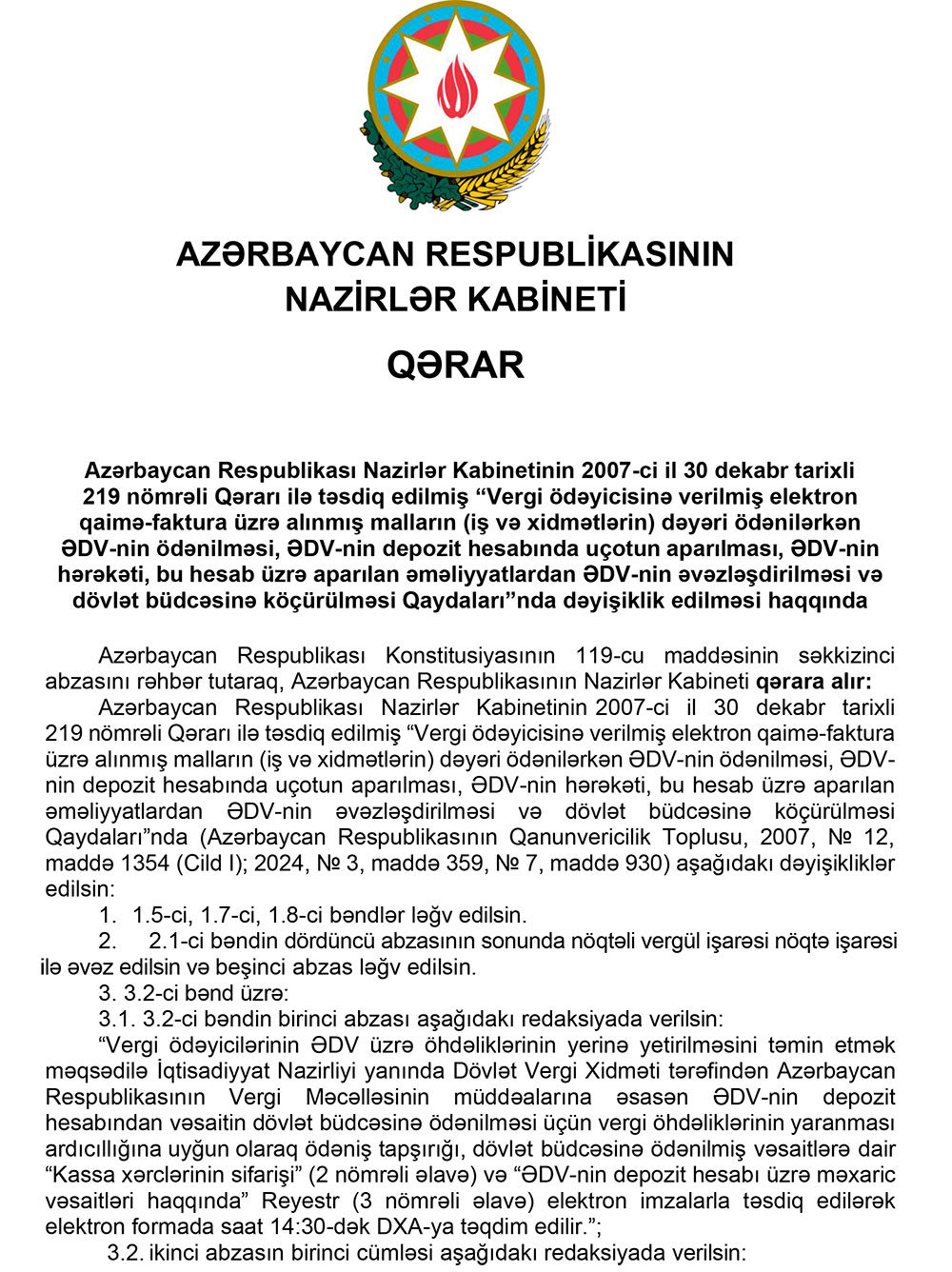 Nazirlər Kabineti 30 dekabr 2007-ci il tarixli qərarı ilə təsdiq edilmiş “Vergi ödəyicisinə verilmiş elektron qaimə-faktura üzrə alınmış malların (iş və xidmətlərin) dəyəri ödənilərkən ƏDV-nin ödənilməsi, ƏDV-nin depozit hesabında uçotun aparılması, ƏDV-nin hərəkəti, bu hesab üzrə aparılan əməliyyatlardan ƏDV-nin əvəzləşdirilməsi və dövlət büdcəsinə köçürülməsi Qaydaları”nda dəyişiklik edib.