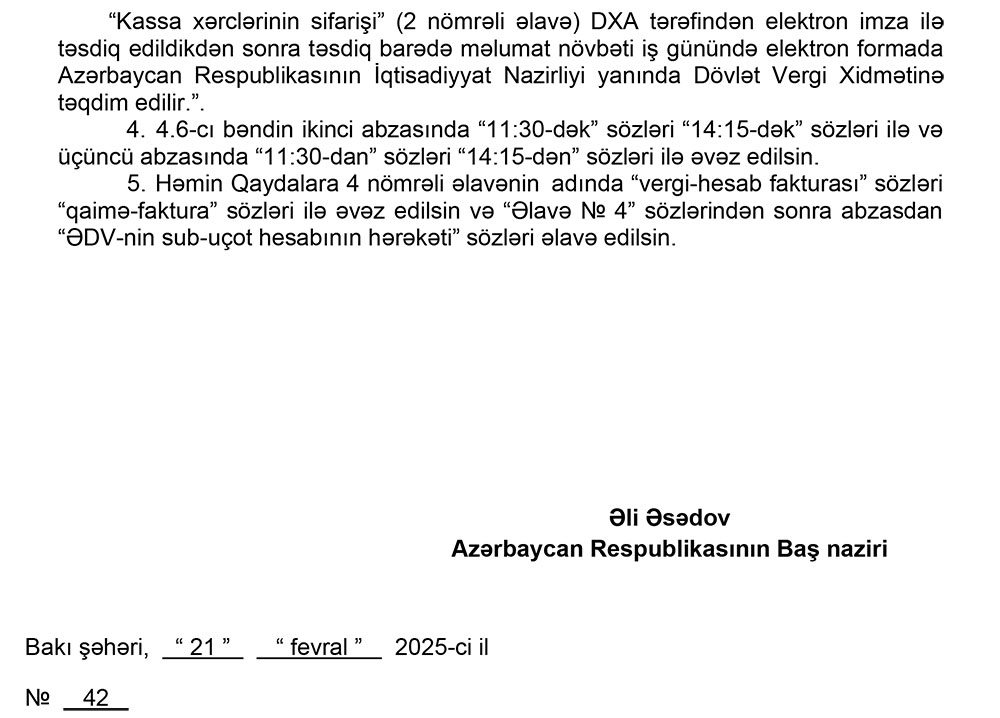 Qərara əsasən, mal (iş, xidmət) təqdim edən satıcı tərəfindən alıcıya təqdim olunan elektron qaimə-fakturalarda ƏDV məbləğinin köçürülməsi üçün nəzərdə tutulan ƏDV-nin depozit hesabının rekvizitlərinin göstərilməsi, bina tikintisi fəaliyyəti ilə məşğul olan şəxs tərəfindən alıcıya təqdim olunan elektron qaimə-fakturada, müqavilədə, qəbzdə və ya çekdə ƏDV məbləğinin köçürülməsi üçün nəzərdə tutulan ƏDV-nin depozit hesabının rekvizitlərinin göstərilməsi, ölkə ərazisində istehsal olunan kənd təsərrüfatı məhsullarının pərakəndə ticarət fəaliyyəti ilə məşğul olan şəxs tərəfindən alıcıya təqdim olunan elektron vergi hesab-fakturasında, qəbzdə, çekdə, elektron qaimə-fakturada ƏDV-nin məbləğinin köçürülməsi üçün nəzərdə tutulan ƏDV-nin depozit hesabının rekvizitlərinin göstərilməsi, nəmin məhsulların alıcılarının elektron vergi hesab-fakturasında, qəbzdə, çekdə, elektron qaimə-fakturada göstərilən kənd təsərrüfatı məhsullarının ƏDV-siz dəyərini onları təqdim edən şəxsin bank və digər ödəniş hesabına, ticarət əlavəsindən hesablanan ƏDV-nin məbləğini isə ƏDV-nin depozit hesabına köçürməsi tələbləri ləğv edilib.