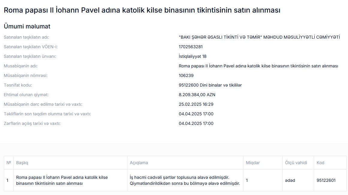 Bakıda 8 milyon manata katolik kilsə binası tikiləcək
