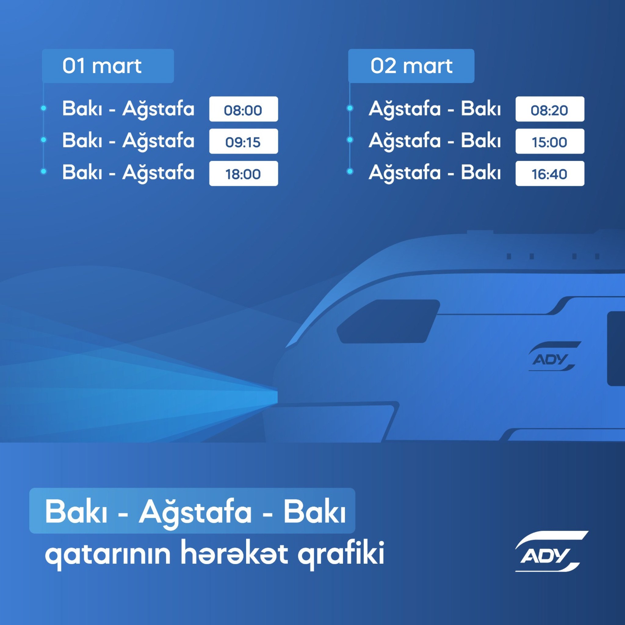 Azərbaycan Dəmir Yolları (ADY) Bakı-Ağstafa-Bakı marşrutuna artan sərnişin tələbatını təmin etmək məqsədilə bu xətt üzrə 1 və 2 mart tarixlərində əlavə qatar reysləri təyin edir.