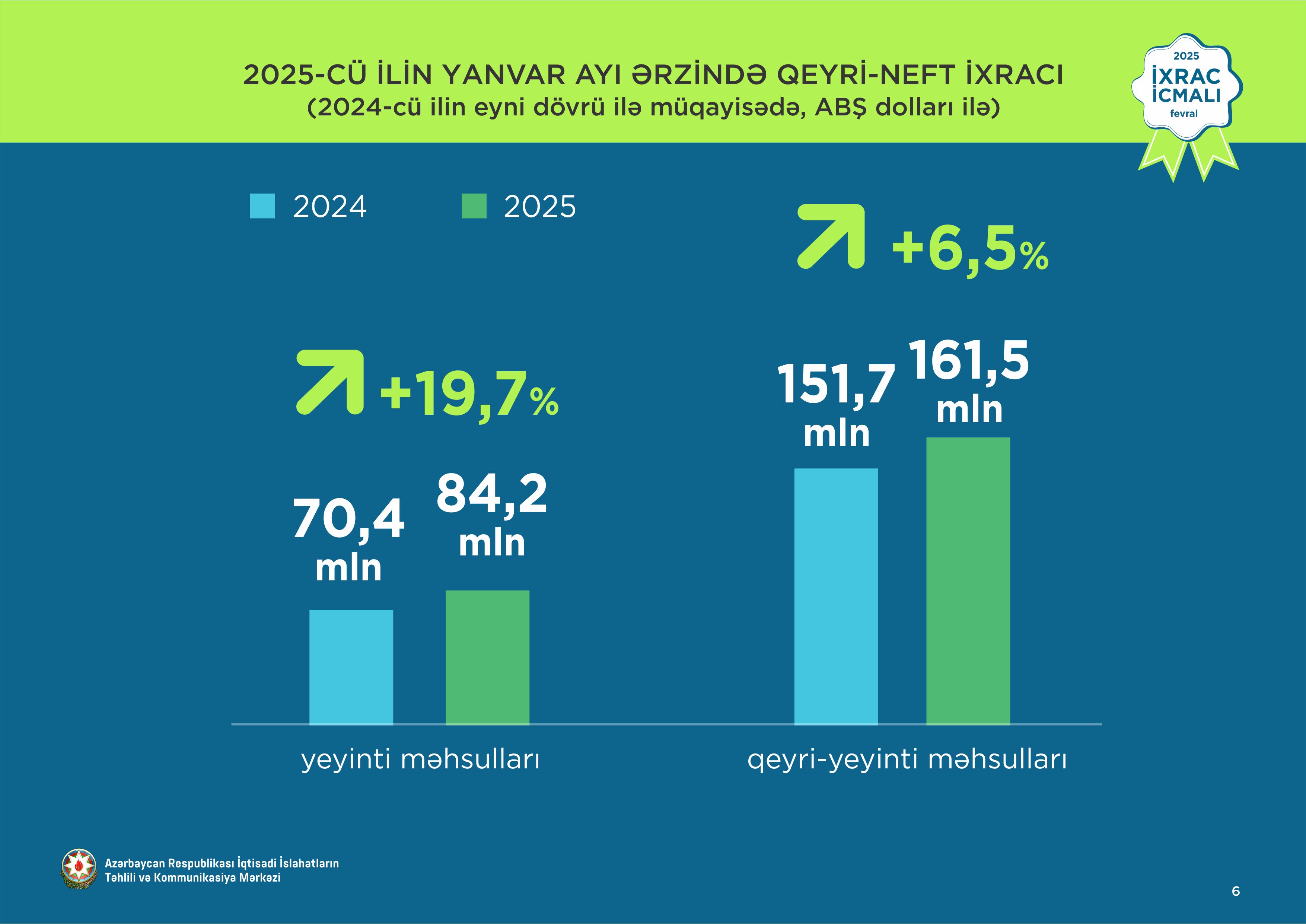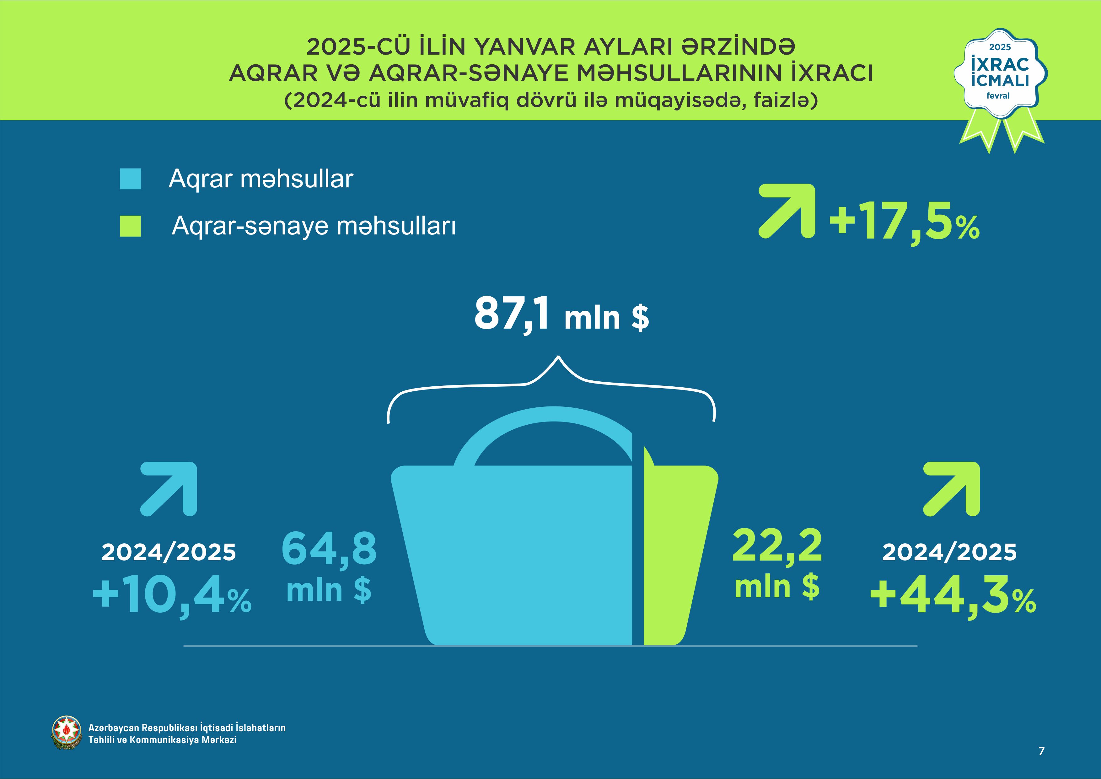 2025-ci ilin yanvar ayında aqrar məhsulların ixracı 10,4% artaraq 64,8 milyon ABŞ dolları, aqrar-sənaye məhsullarının ixracı 44,3% artaraq 22,2 milyon ABŞ dollarına bərabər olub. Bütövlükdə aqrar və aqrar-sənaye məhsullarının birgə ixracı 17,5% artaraq 87,1 milyon ABŞ dolları təşkil edib.