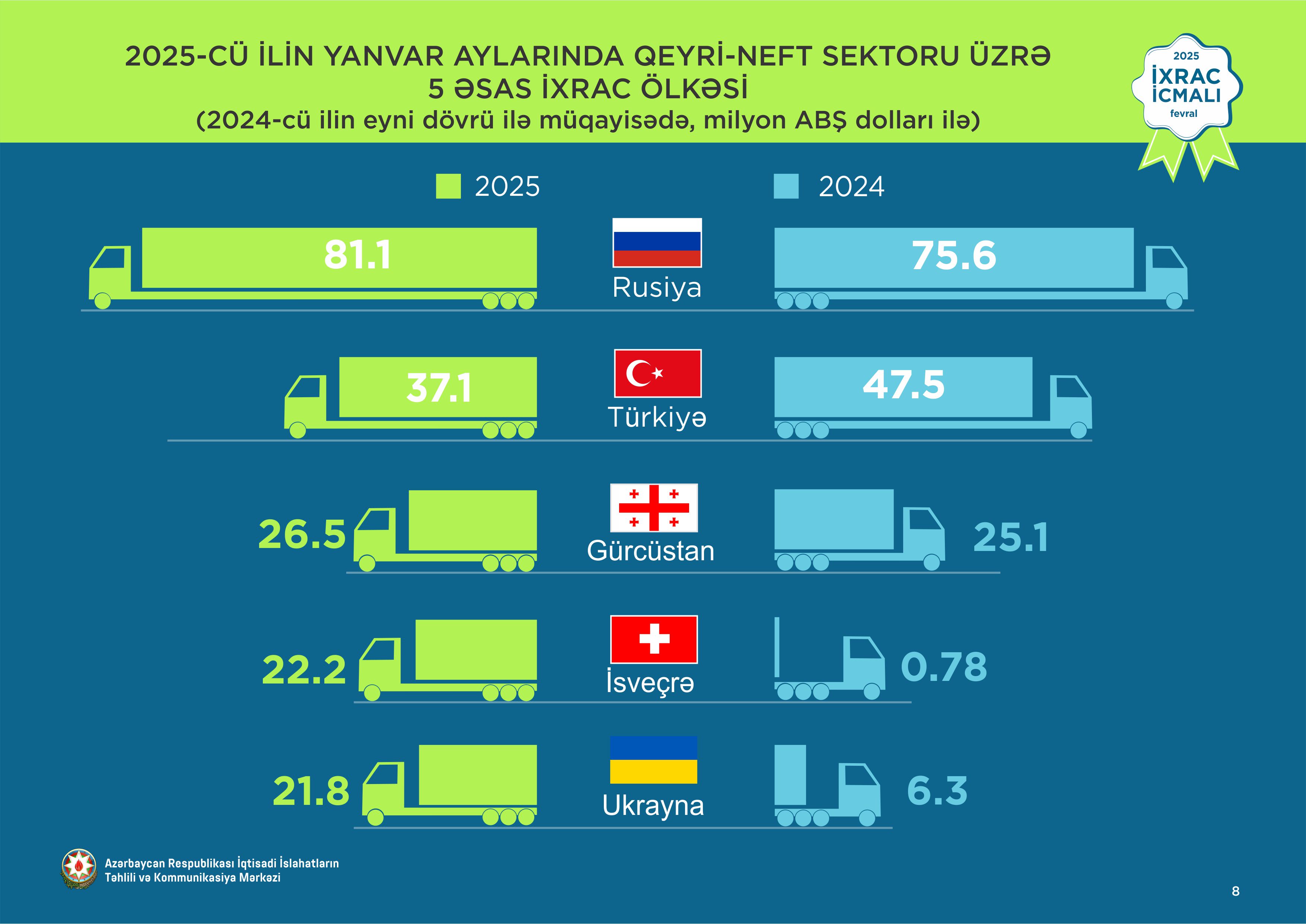 Qeyd olunan müddətdə Rusiya Federasiyasına 81,1 milyon ABŞ dolları, Türkiyəyə 37,1 milyon ABŞ dolları, Gürcüstana 26,5 milyon ABŞ dolları, İsveçrəyə 22,2 milyon ABŞ dolları, Ukraynaya isə 21,8 milyon ABŞ dolları dəyərində qeyri-neft sektoruna aid mal ixrac olunub.