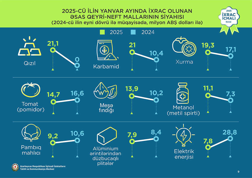 Qızıl 1-ci, karbamid 2-ci, xurma 3-cü yerdə qərarlaşıb - YANVARIN İXRAC RƏQƏMLƏRİ AÇIQLANDI