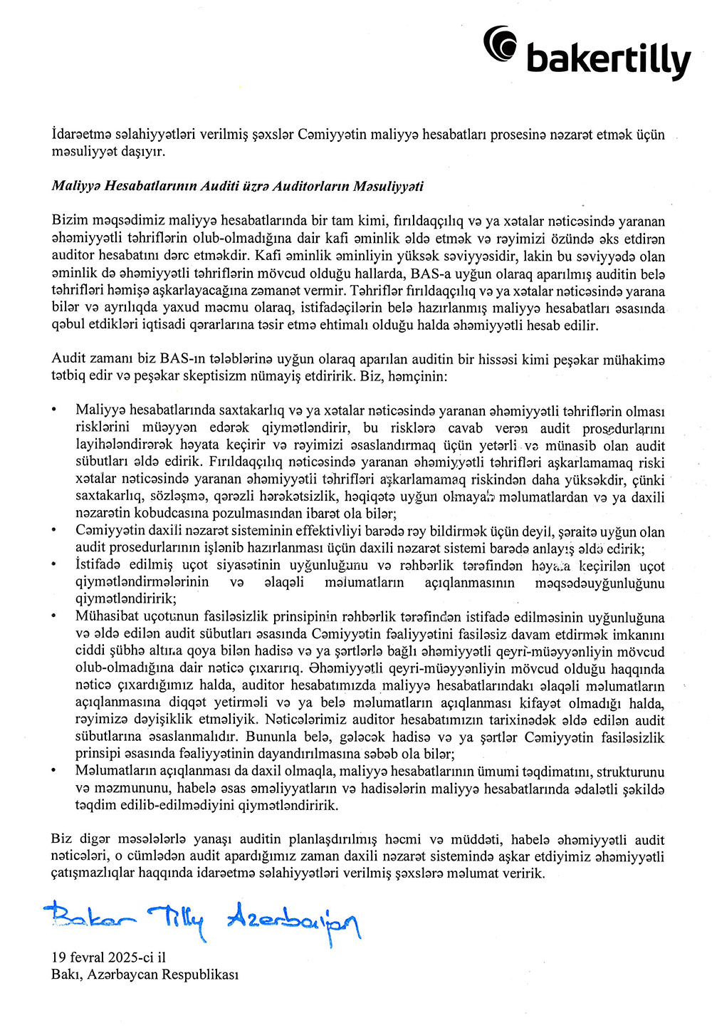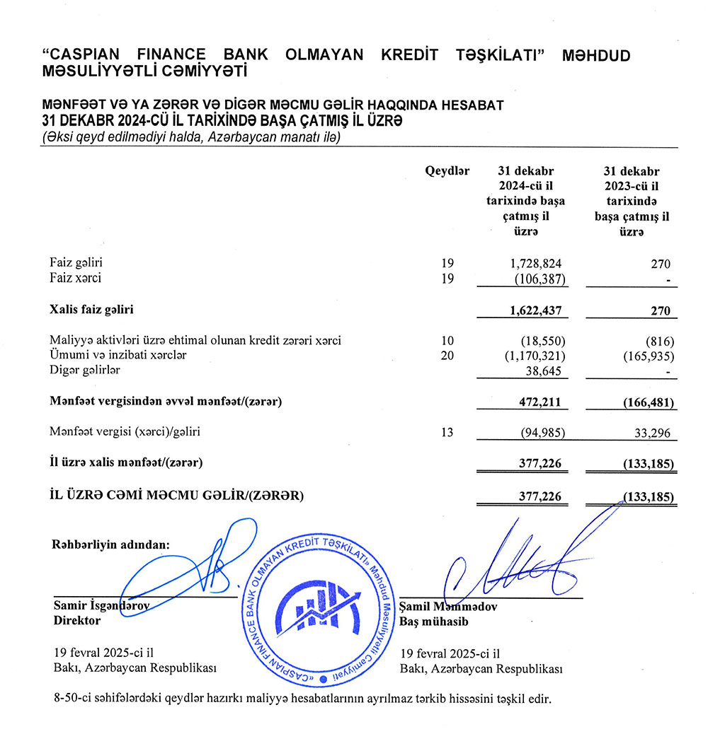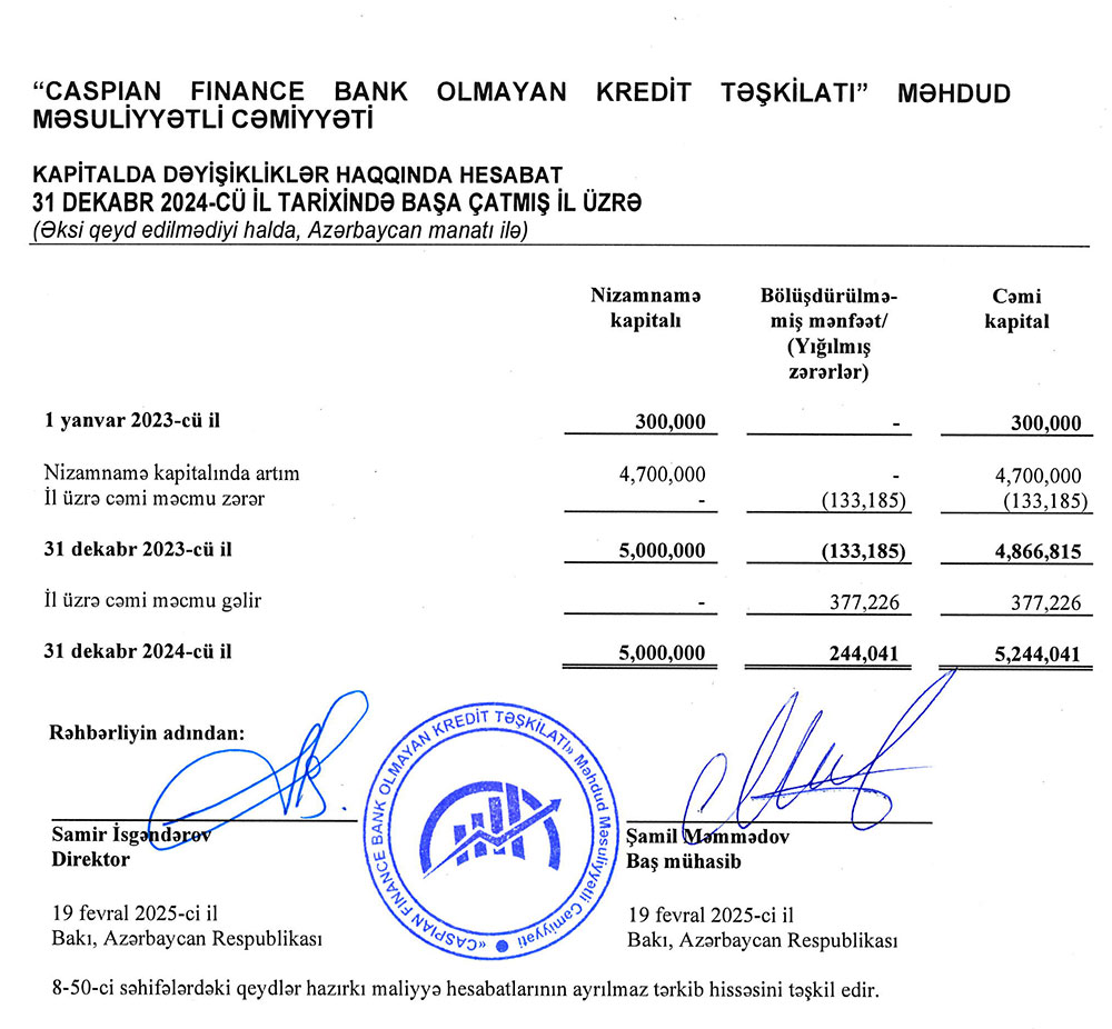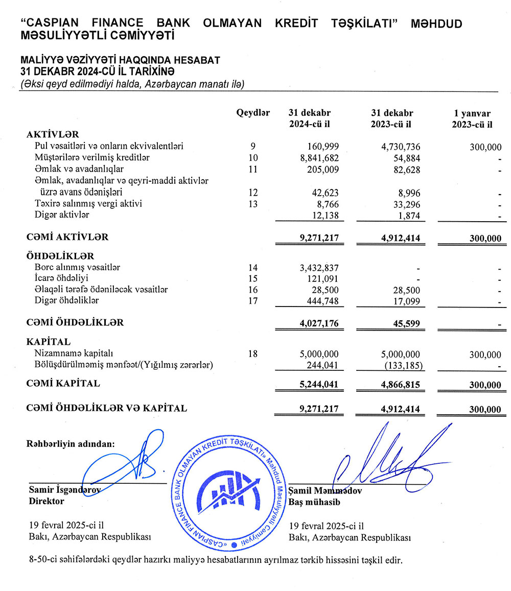 “CASPIAN FINANCE BOKT” 2024-cü ili yarım milyona yaxın mənfəətlə başa vurub