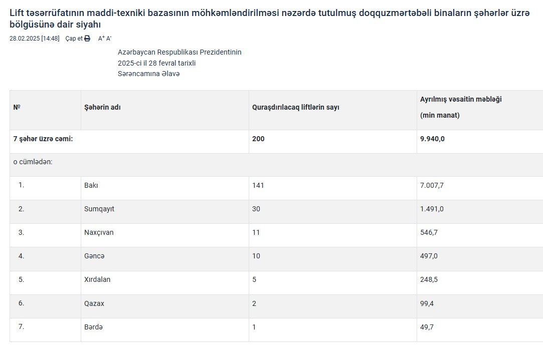 Marja xəbər verir ki, Sərəncama əsasən, Azərbaycan Respublikasının 7 şəhərində çoxmənzilli binaların lift təsərrüfatının maddi-texniki bazasının möhkəmləndirilməsi məqsədilə “Azərbaycan Respublikasının 2025-ci il dövlət büdcəsi haqqında” Azərbaycan Respublikasının 2024-cü il 16 dekabr tarixli 93-VIIQ nömrəli Qanununun tətbiqi ilə bağlı bir sıra məsələlər barədə” Azərbaycan Respublikası Prezidentinin 2024-cü il 27 dekabr tarixli 268 nömrəli Fərmanının 1.12.4.4.12-ci (Təhlükəsizlik, sosial-iqtisadi və digər tədbirlərin maliyyələşdirilməsi) abzasında nəzərdə tutulmuş vəsaitdən 9 milyon 940 min manatı bu Sərəncama əlavə edilmiş siyahıya uyğun olaraq şəhər və rayon icra hakimiyyətlərinə ayrılır.