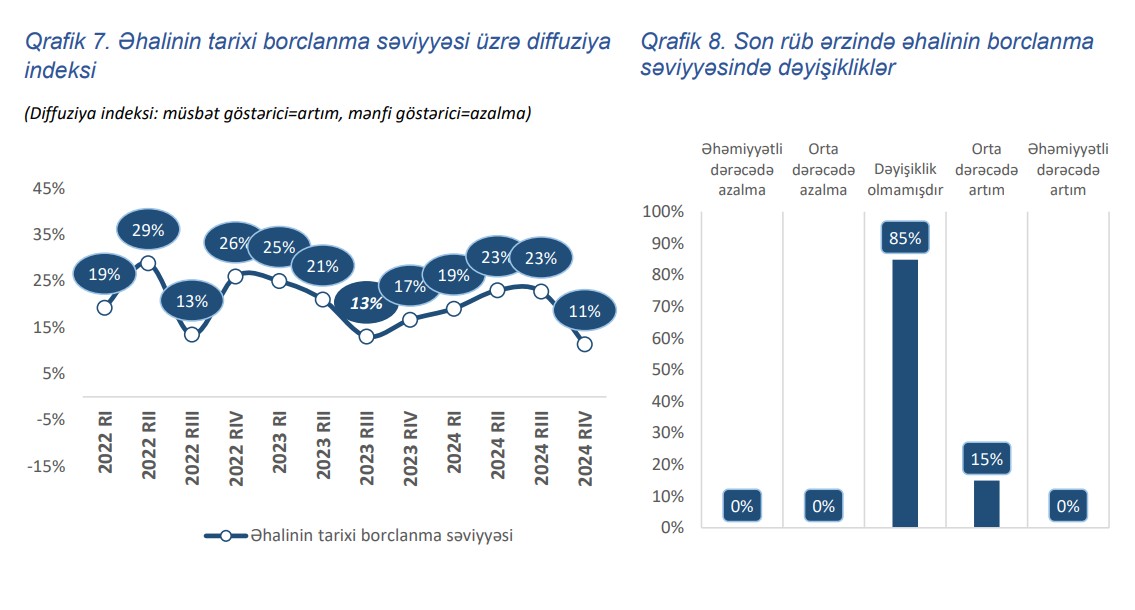 Nəticədə 2024-cü ilin IV rübü üzrə diffuziya indeksi 11% təşkil edib. Bu isə əhalinin borclanma səviyyəsində artım dinamikasının davam etdiyini göstərir.