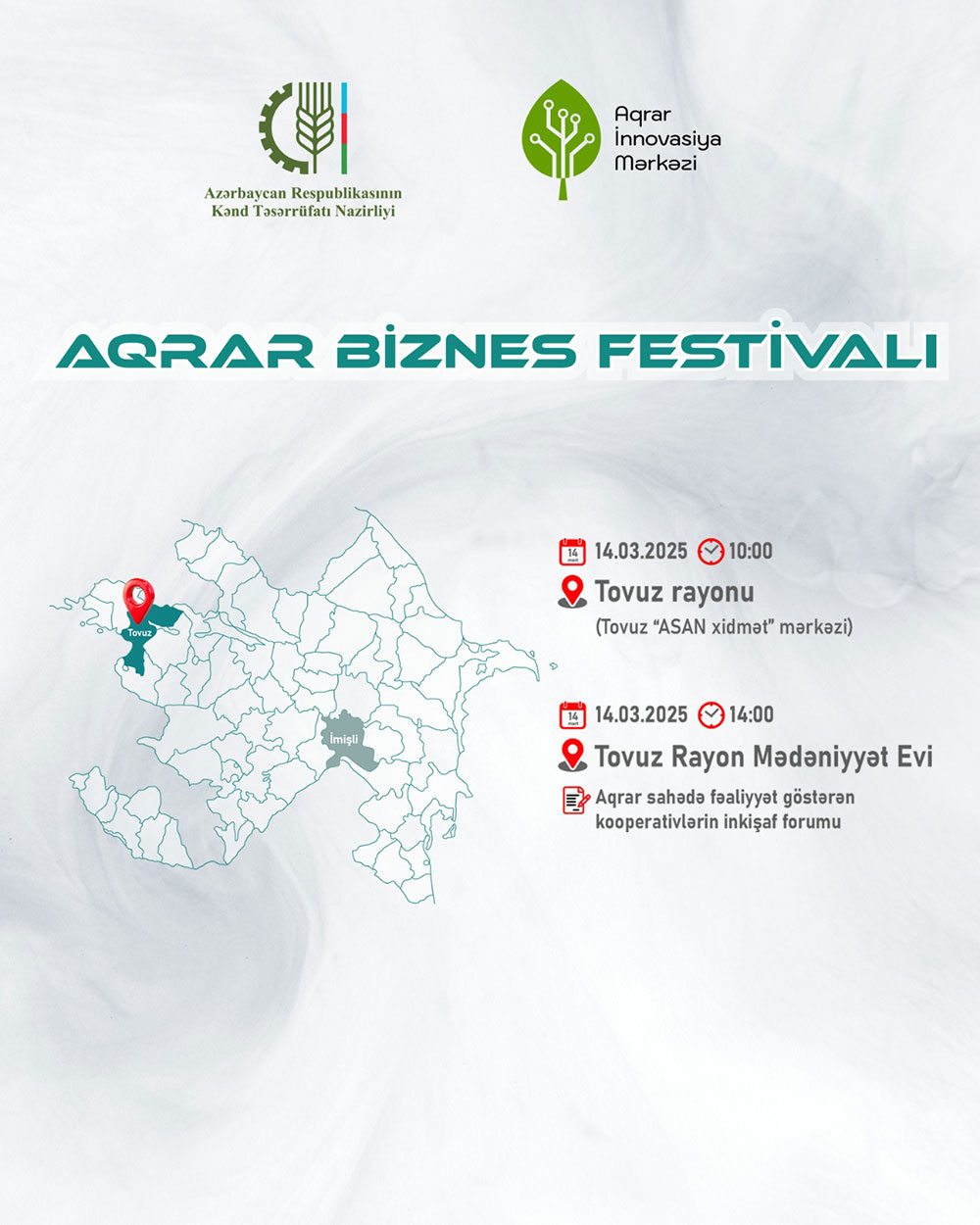 Tovuzda “Aqrar sahədə fəaliyyət göstərən kooperativlərin inkişafı” forumu keçiriləcəkKənd Təsərrüfatı Nazirliyinin Aqrar İnnovasiya Mərkəzinin təşkilatçılığı ilə Tovuz rayonunda növbəti Aqrar Biznes Festivalı keçiriləcək. Festival martın 14-ü saat 10:00-da Tovuz “ASAN xidmət” mərkəzinin qarşısında baş tutacaq.