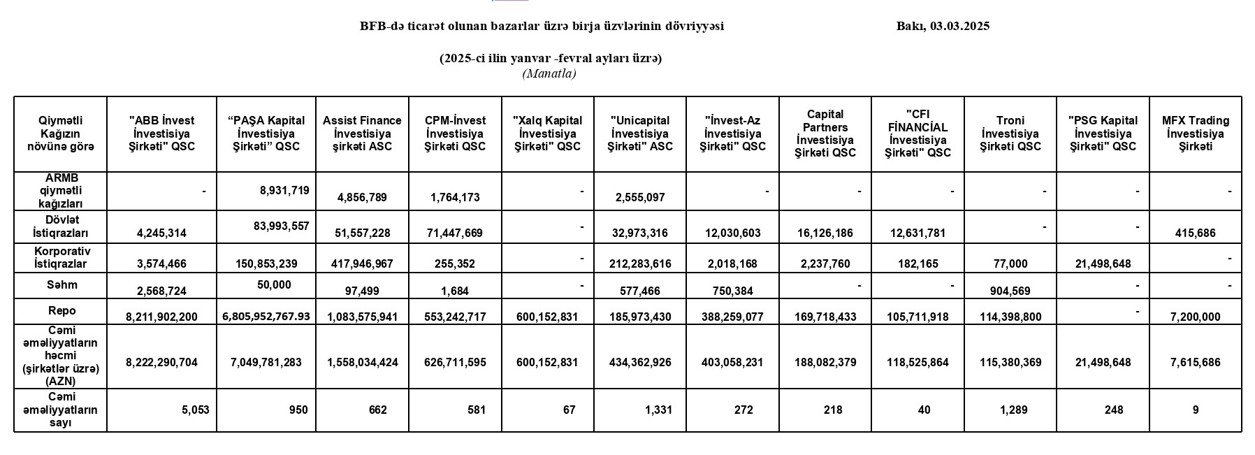 2025-ci ilin yanvar -fevral ayları üzrə Bakı Fond Birjasında (BFB) ticarət olunan bazarlar üzrə birja üzvlərinin dövriyyələri açıqlanıb.