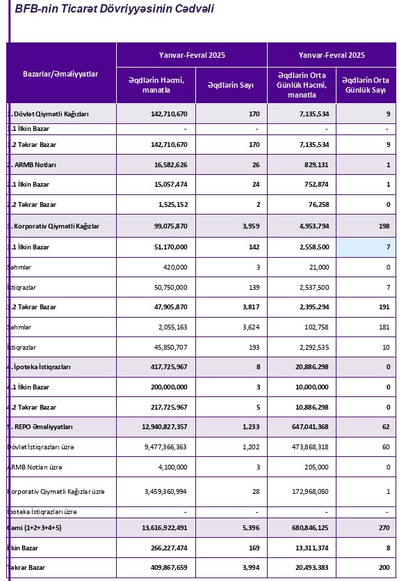 2025-ci ilin ilk 2 ayında BFB-də əməliyyatların cəmi həcminin 95%-ni və ya 12 milyard 940 milyon 827 min manatını repo əməliyyatları təşkil edib. 2024-cü ilin ilk 2 ayında Birjada əməliyyatların cəmi həcminin 65,5%-ni və ya 3 milyard 473 miylon 124 min manatını repo əməliyyatları təşkil etmişdi. Beləliklə, repo əməliyyatlarının həcmi 2025-ci ilin yanvar-fevral ayları ərzində ötən ilin eyni dövrü ilə müqayisədə 3,7 dəfə artıb.