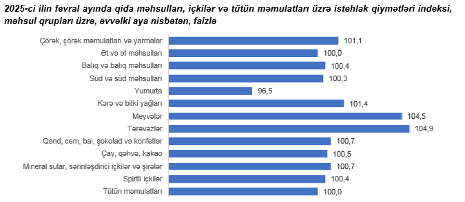 2025-ci ilin fevral ayında qida məhsulları, içkilər və tütün məmulatları üzrə istehlak qiymətləri indeksi əvvəlki aya nisbətən 1,4 faiz, yanvar-fevral aylarında isə əvvəlki ilin müvafiq dövrünə nisbətən 5,3 faiz artıb.