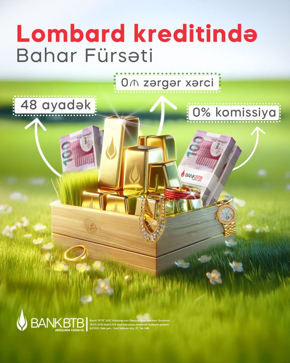 Kampaniya çərçivəsində qızıl və qızıl zinət əşyalarınızı girov qoymaqla ən uzunmüddətli krediti 48 ay müddətinədək əldə edə bilərsiniz.